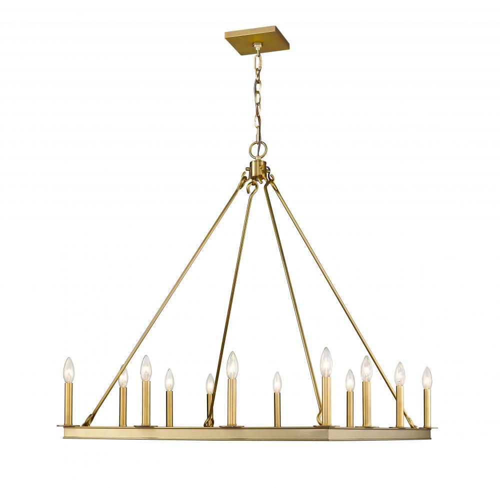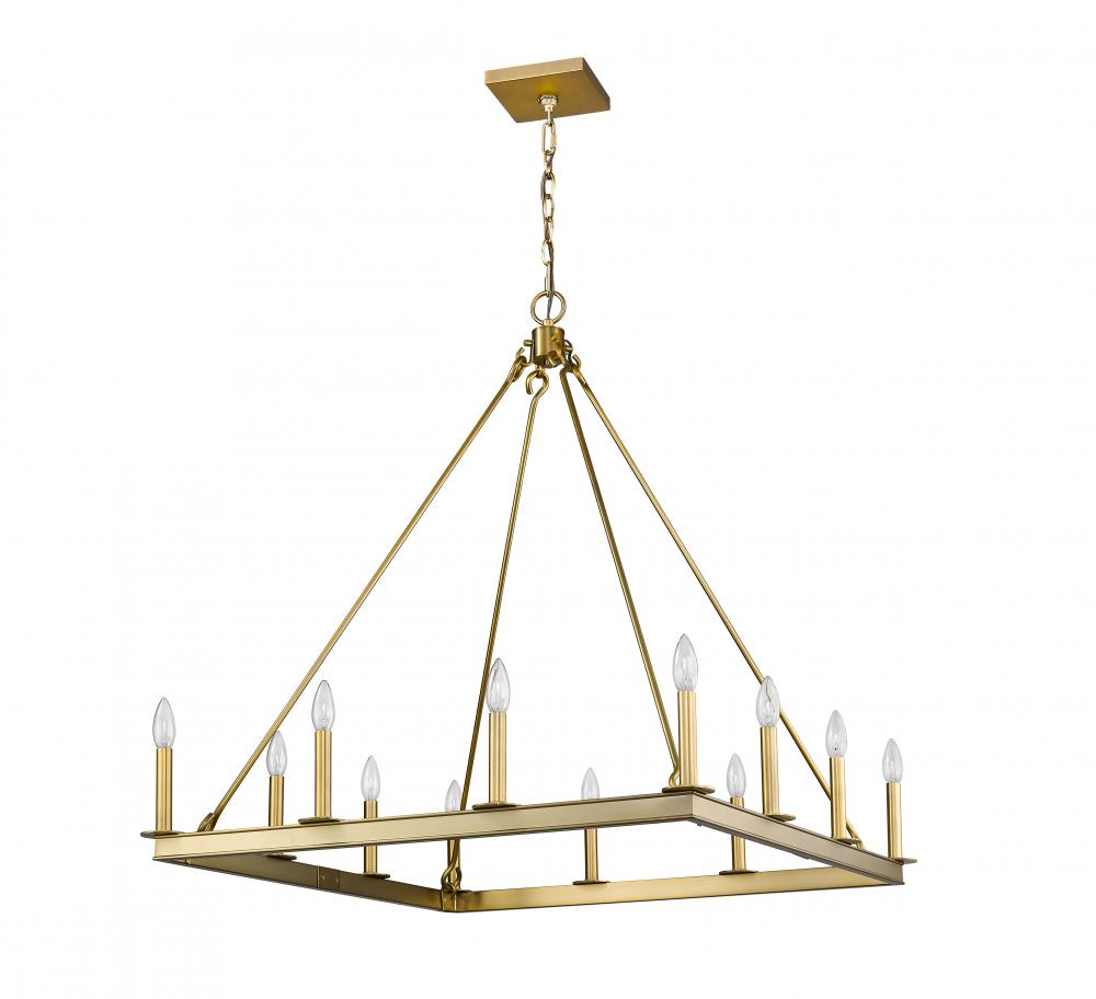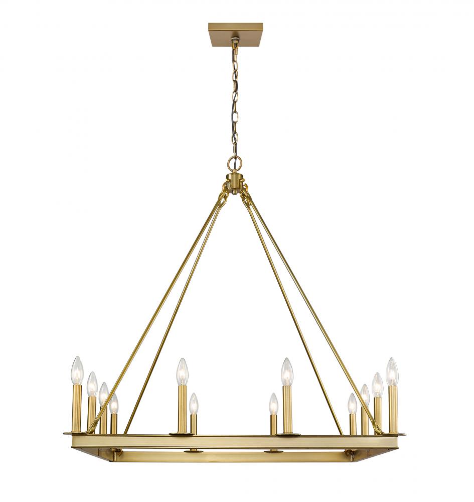 Elevate the elegance of your home lighting with this majestic twelve-light chandelier. It features a lustrous olde brass finish with the candle-inspired lights in a bold square design. Its the chandelier youve been looking for to light up your dining room, foyer, or kitchen.