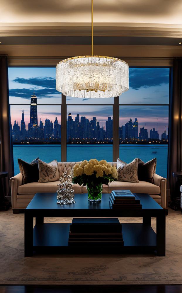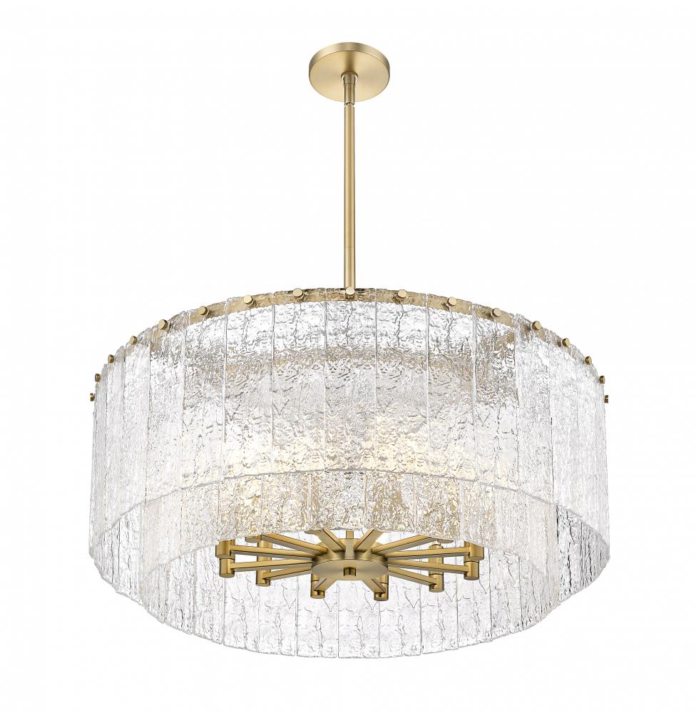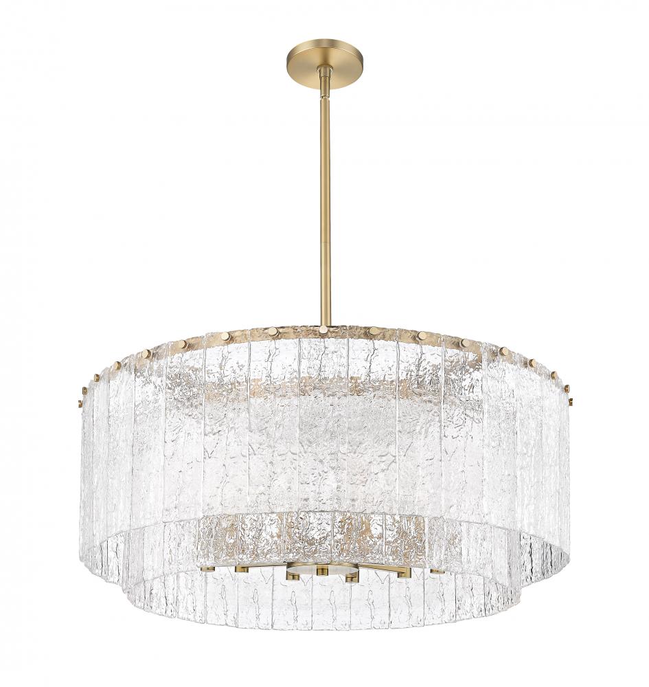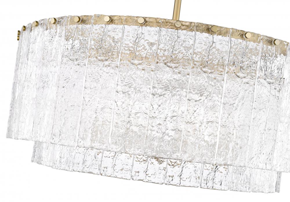 Decadence and radiance are a sophisticated pairing for this modern 12-light pendant. A stunning centerpiece over a foyer or dining table, it boasts a round, two-tiered framework crafted in durable steel that receives a modern gold finish that impresses with its elegant warmth. Vertical panels of clear textured glass create the impression of melting ice, instilling incredible texture and dimensionality.