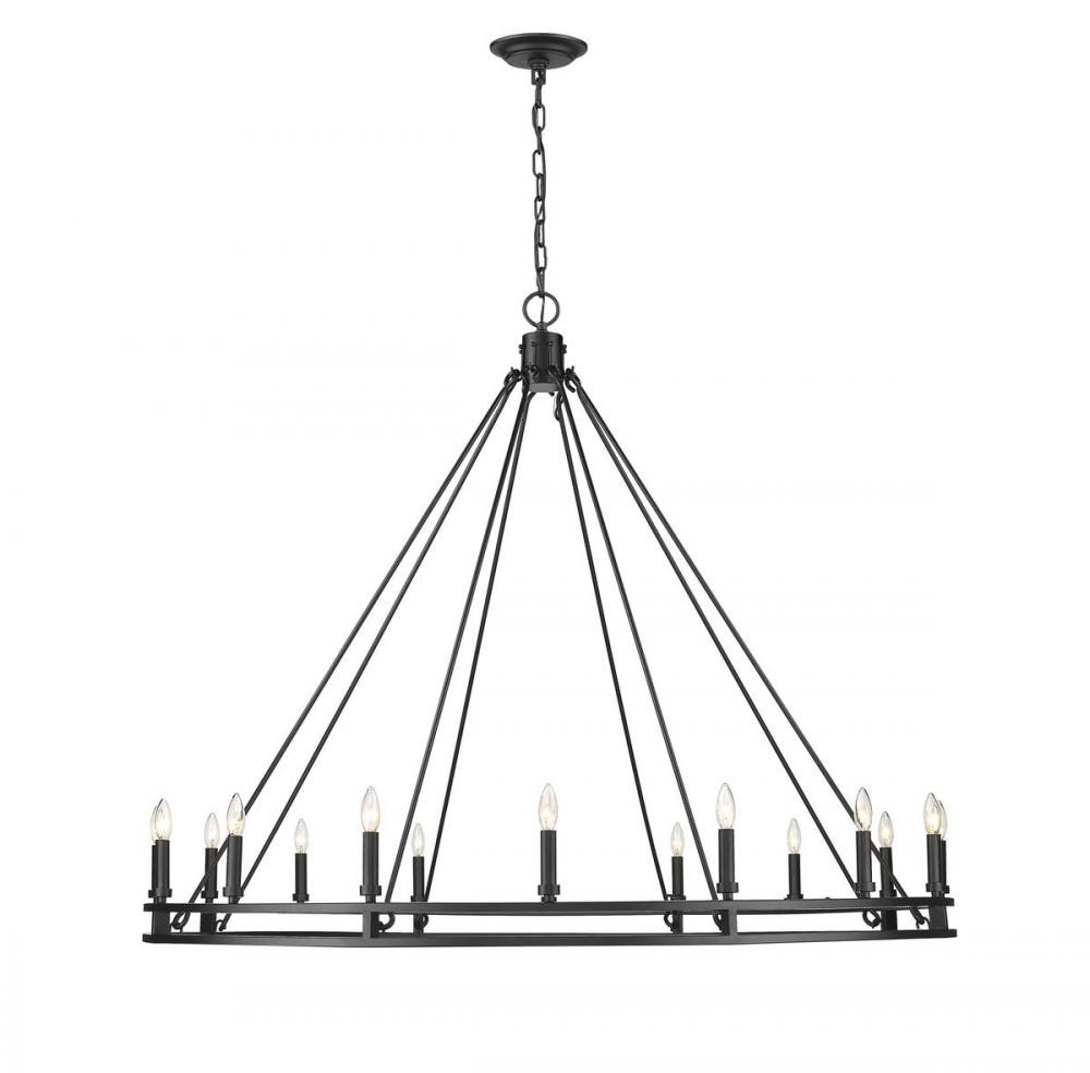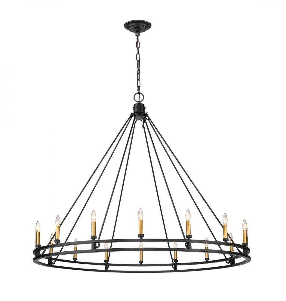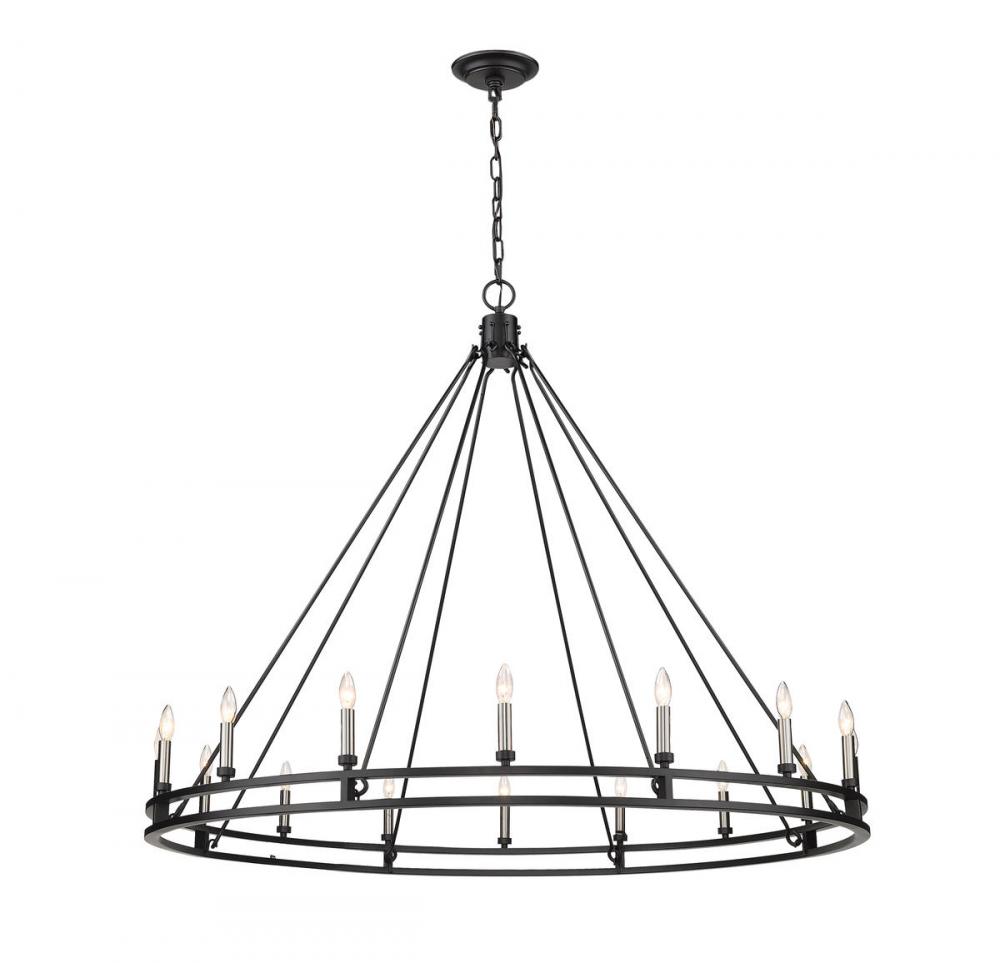 Palatial elegance offers a charming attitude that illuminates a classic custom space. This sixteen-light chandelier adopts a dramatic aesthetic with geometric influence, showcasing candelabra bulb mounts on a Modern Matte Black finish ring frame.