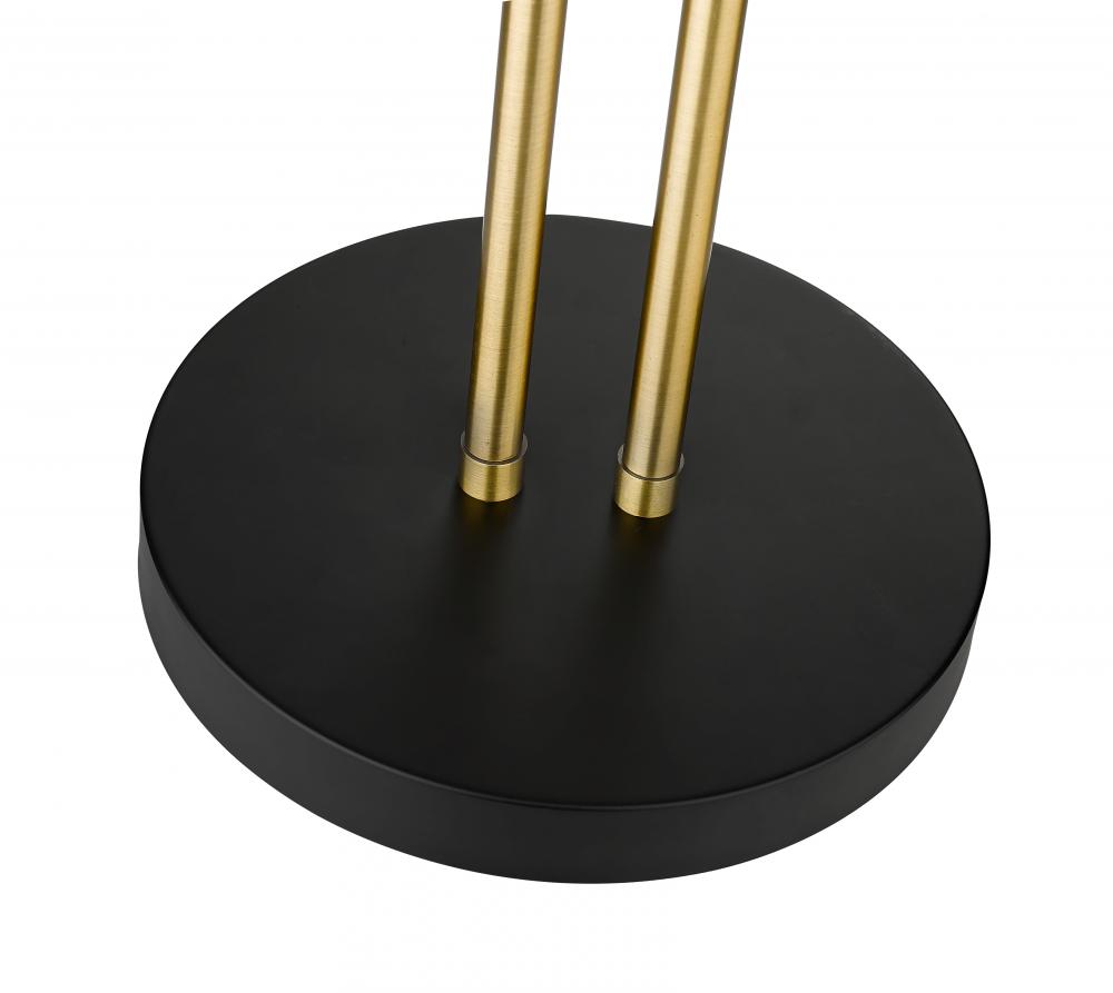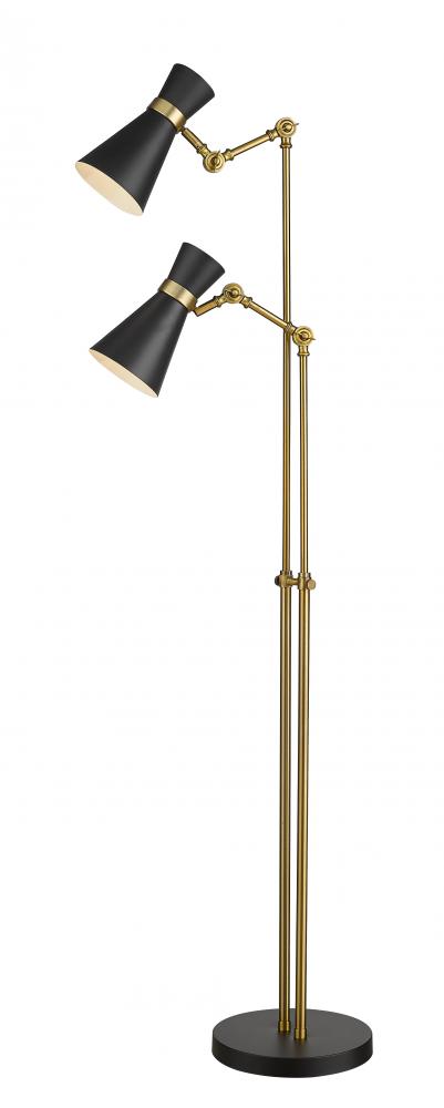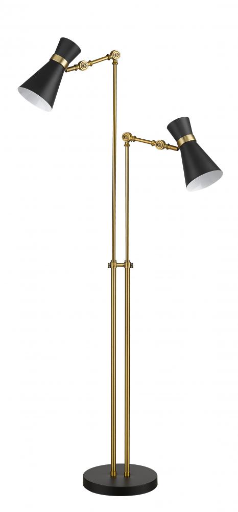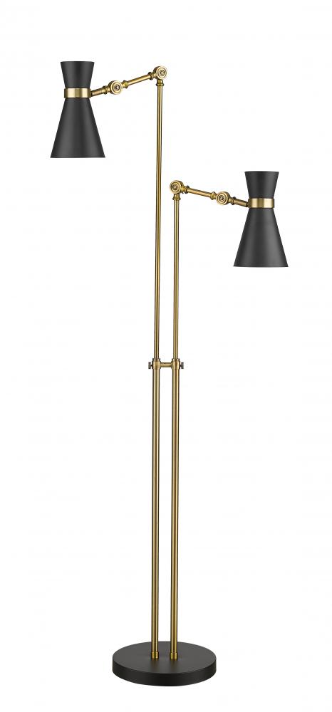 A character-rich studio theme shapes industrial influence that adds casual elegance to this matte black finish steel two-light floor lamp. This lamp features a touch controlled shade with thrree levels; high, low and off. Dress up a living room or office space with this tasteful fixture trimmed with heritage brass finish steel. This sleek two-light fixture reflects the heart of romantic industrial charm.