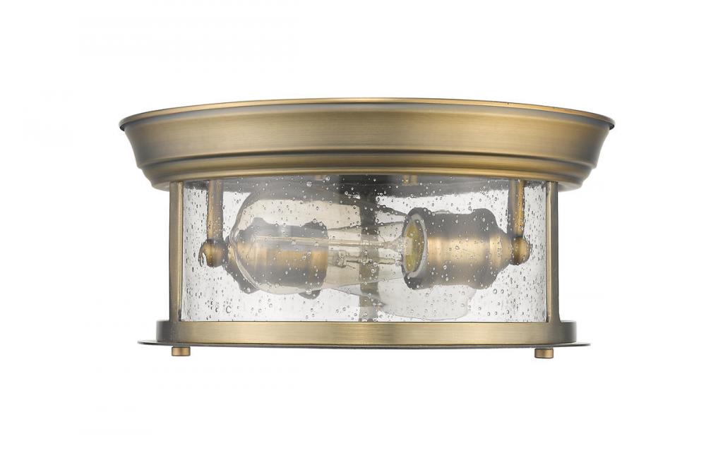 Cool industrial ambiance offers a stylish look to transitional spaces in need of functional, fashionable fixtures. With tastefully warm Heritage Brass finish metal providing a circular cage-like frame and a wide cylindrical clear seedy glass shade completing its visual package, this two-light flush mount ceiling light wraps up a custom kitchen or living area design.