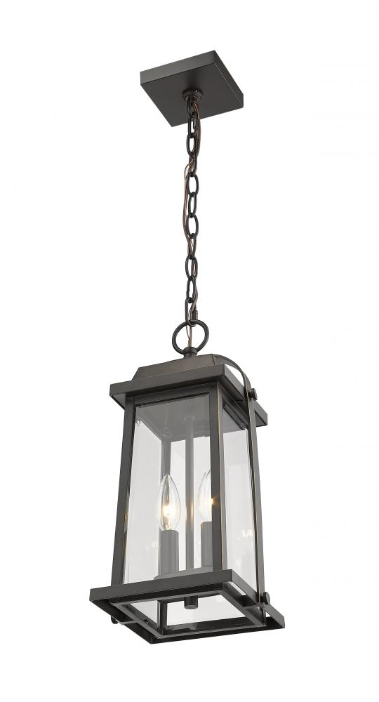Illuminate a front porch or covered back patio with this charming outdoor hanging light. With a classic lantern silhouette and inviting oil rubbed bronze finish, the pendant is complete with two lights tucked behind clear beveled glass.