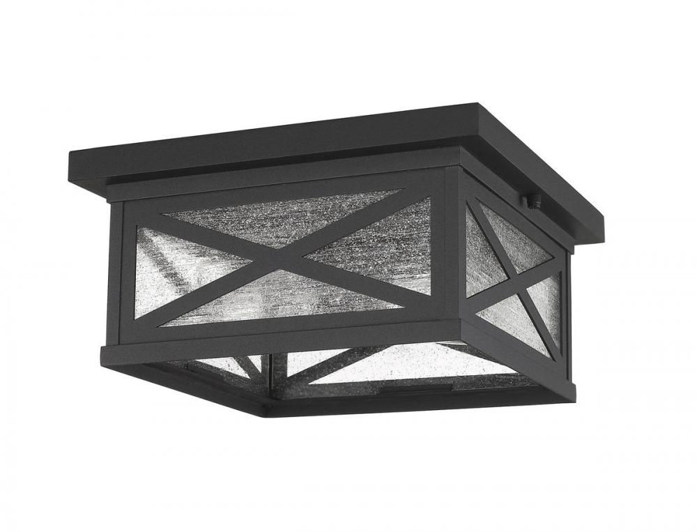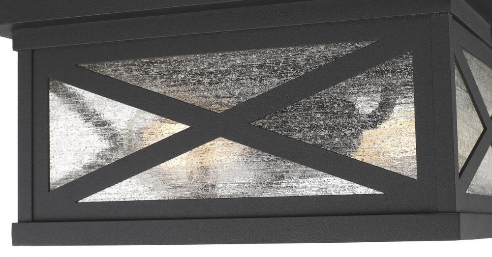 Gear up for an energizing look in exterior spaces with this outdoor flushmount ceiling light from the Brookside collection. Geometric vibes create a sleek look in a square matte black aluminum cage-style housing with X-shaped accents over clear seedy glass. Glowing light effects offer soft elegance to lift the mood in a covered patio, gazebo, or pool house.