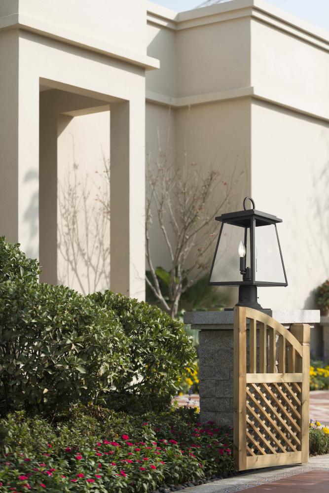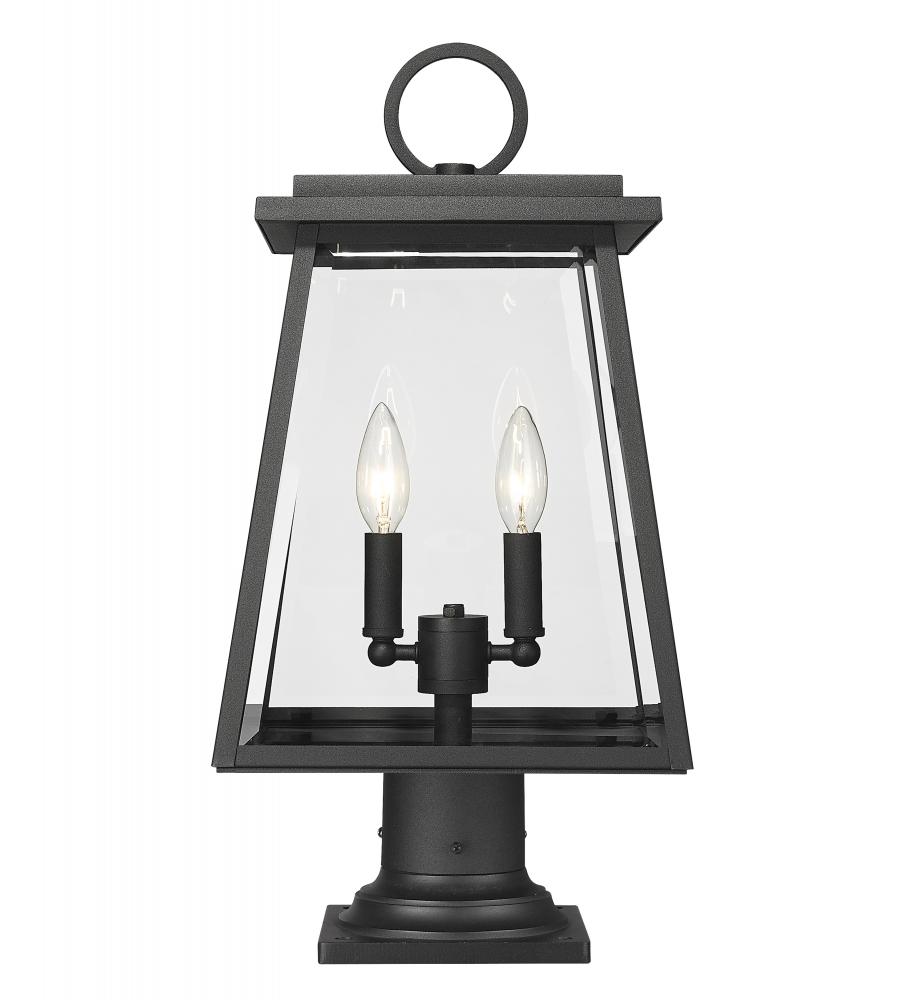 Add the romantic aesthetic of village nautical to a garden or walkway space with this classic light element. From the Broughton collection, this two-light outdoor pier-mounted fixture offers construction of sleek black aluminum and clear beveled glass panels on its lantern-style shade. Charming candelabra bulb mounts seal the deal on a tasteful look.