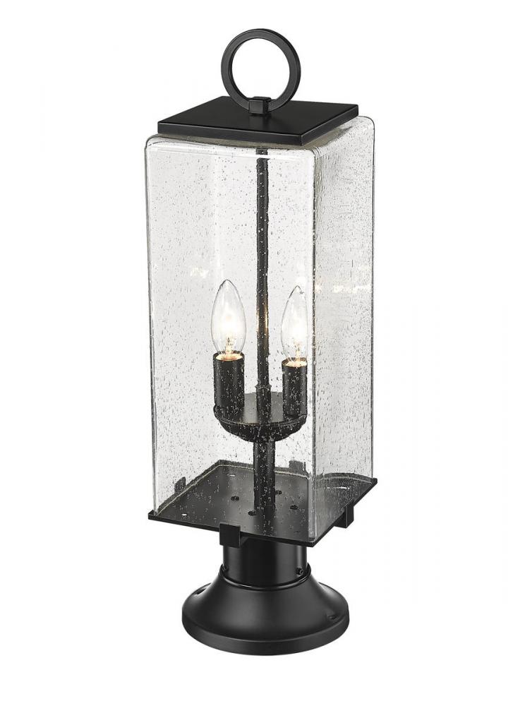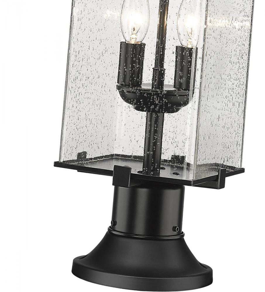 Stylishly provide coastal or contemporary allure to your patio or deck with this two-light outdoor pier mounted fixture. Crafted of steel, this fixture features a black finish and a seedy glass shade for added style.