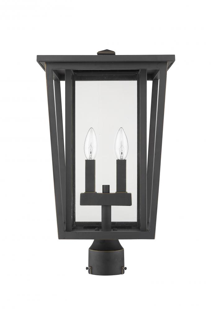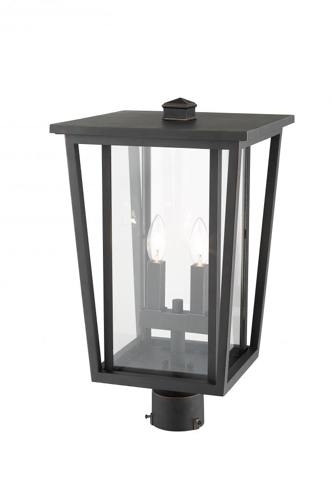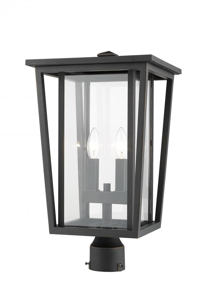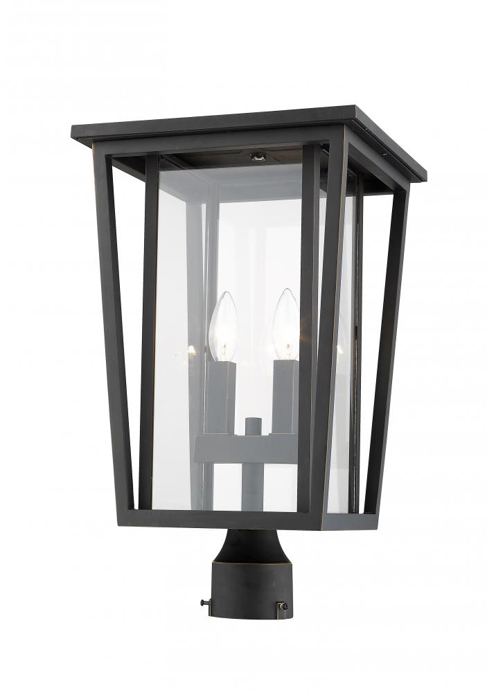 Intriguing motifs of traditional and modern collide to create an artistic fixture perfect for a top notch patio, garden, or front yard. This outdoor post lantern features an inviting rubbed bronze finish and tucks away a candelabra-style bulb base behind clear glass panels.