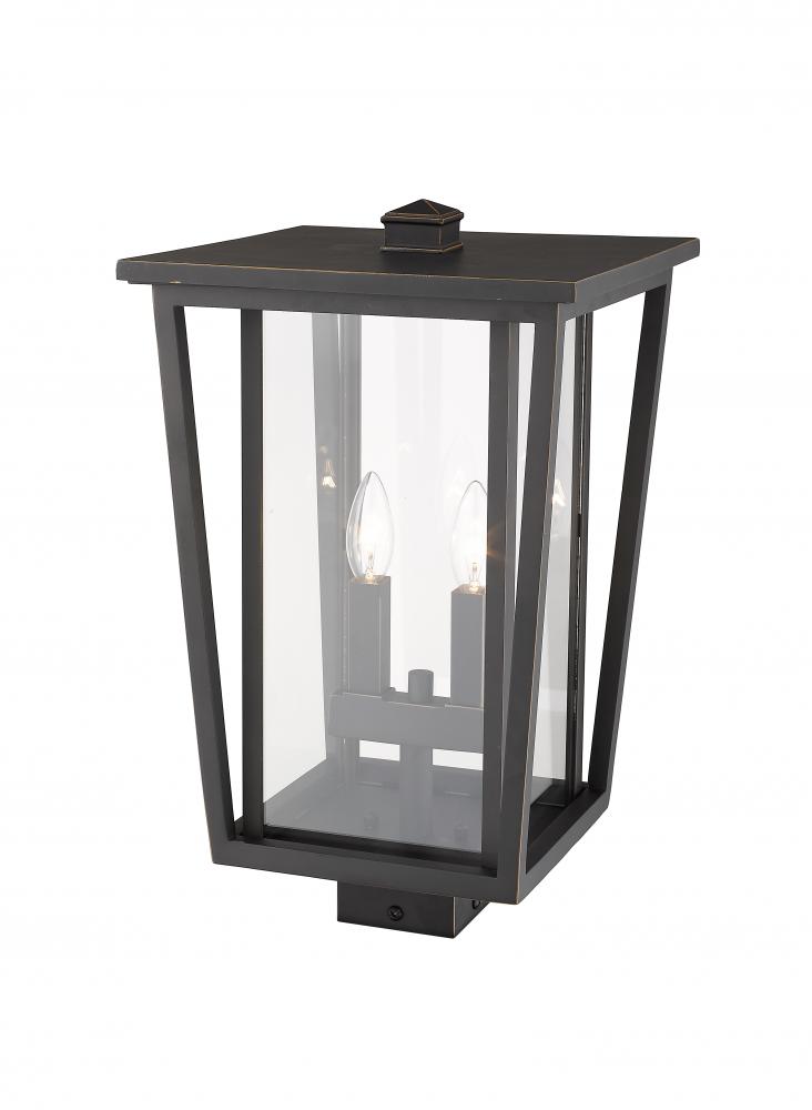 Embrace geometry with a touch of traditional softness. This rubbed bronze finish post lantern blends charming candelabra-style bulb bases with clear glass and a contrasting body, adding a sophisticated feel to a garden or landscaped space.