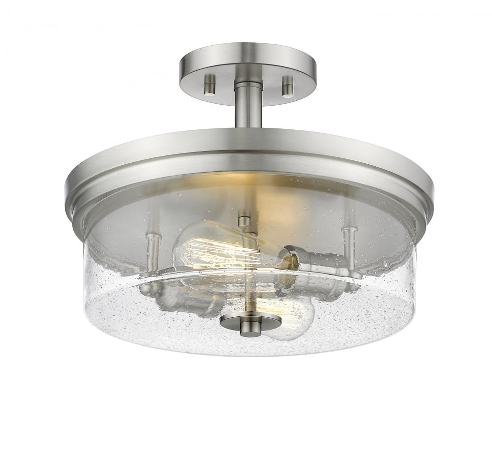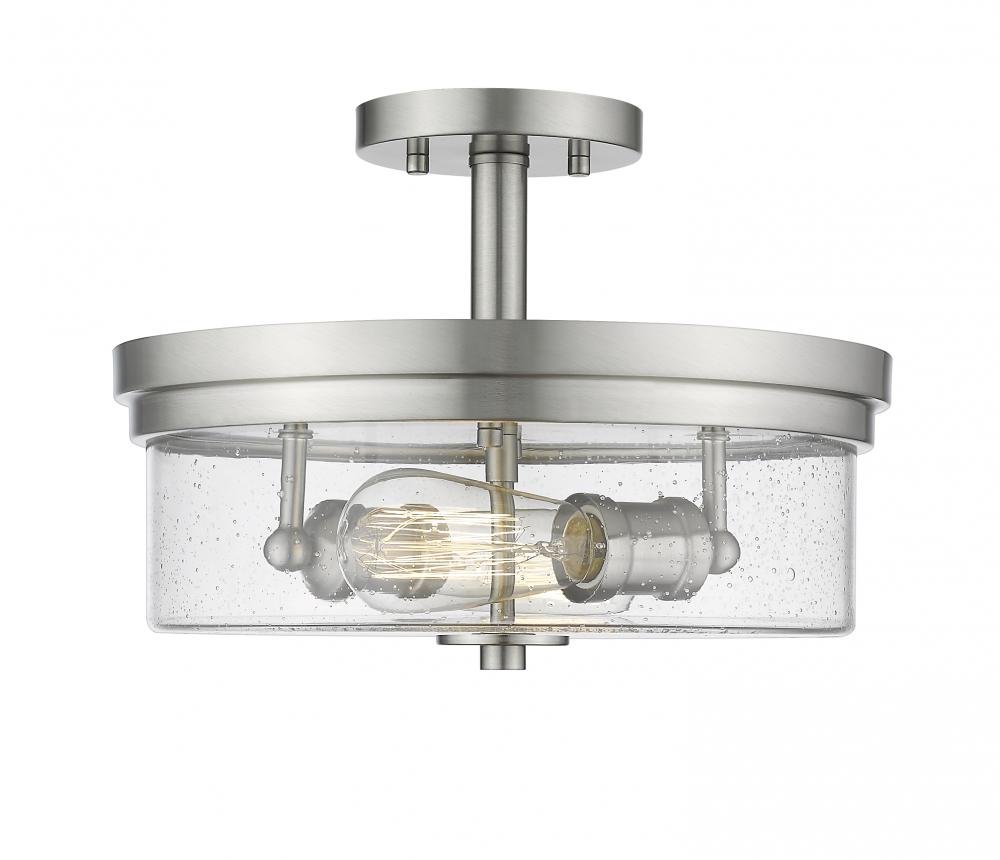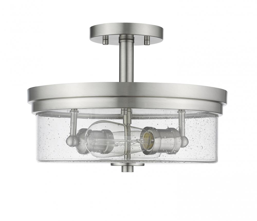 Create an exceptional contemporary or transitional design scheme with the classic styling of this two-light semi-flush mount ceiling light. Enjoy the versatility of elegant brushed nickel in a steel frame, and the romantic clear seedy glass shade that finishes its exquisite composition.