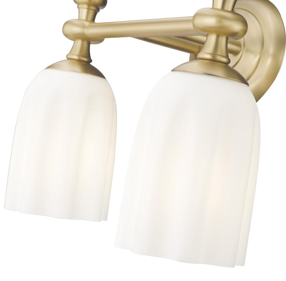 Modern gold lends a sense of warmth to the lovely opal etched glass shades featured on a modern two-light vanity sconce. Delivering diffused lighting with scalloped shades, it lends decorative flair with a charming oval wall plate and flourishes adorning its two arms, perfect for a stylish bathroom setting.