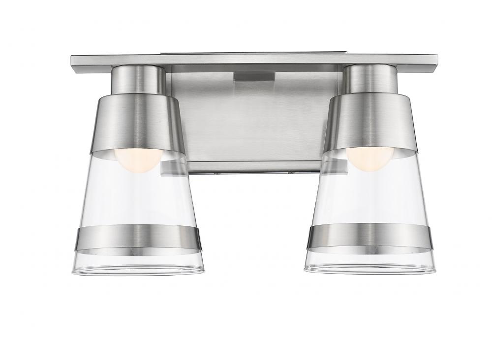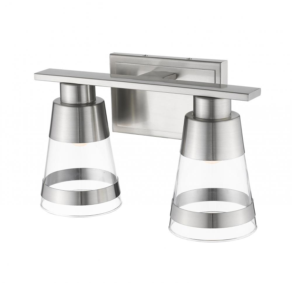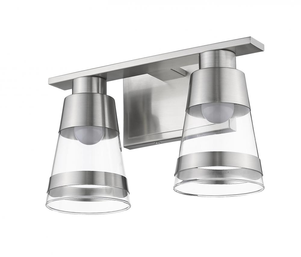 Emphasize design-forward ambiance in a bath space with this exceptional brushed nickel and clear glass two-light vanity. Sporting a hint of nautical flair, its charming modern appeal and energy-saving LED technology makes it a perfect choice.