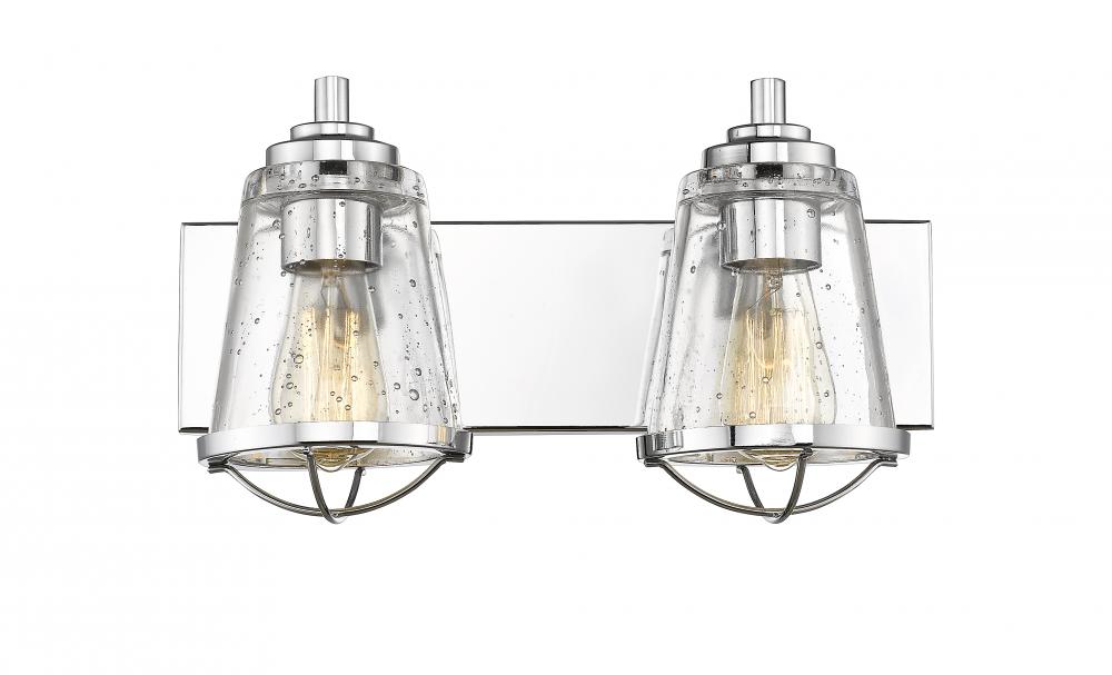 Enjoy a charming nautical look and a bright, shiny ambiance in any bath space. This two-light vanity fixture features lovely seedy glass shades and sleek chrome steel as a mount and design trim.