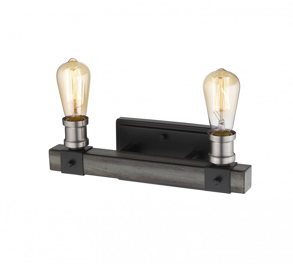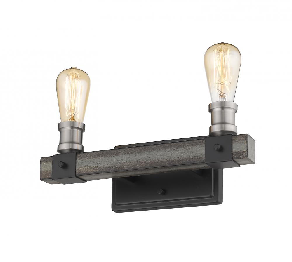Radiate with modern industrial charm from this two-light wall sconce. Constructed of faux barnwood, the sleek backplate features a deep hue and is adorned with ashen accents.