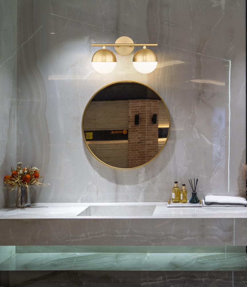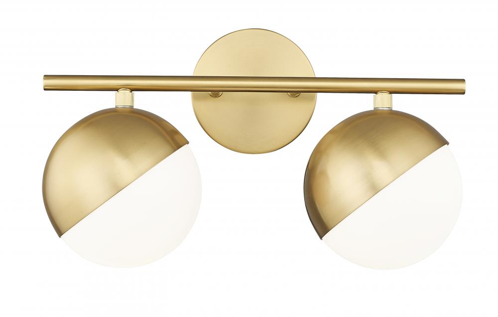 Modern gold finishing sets a rich, warm ambiance for this mid-century two-light vanity bath light. Perfect over a sink, it features moveable metal shields that create directional illumination, perfect for morning and evening rituals or creating a custom look. The fixture boasts white opal glass globe shades echoes in a round wall plate, and includes a round tube arm for a structured, straightforward silhouette.