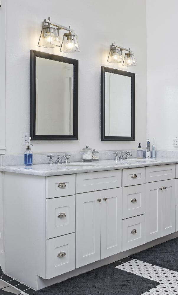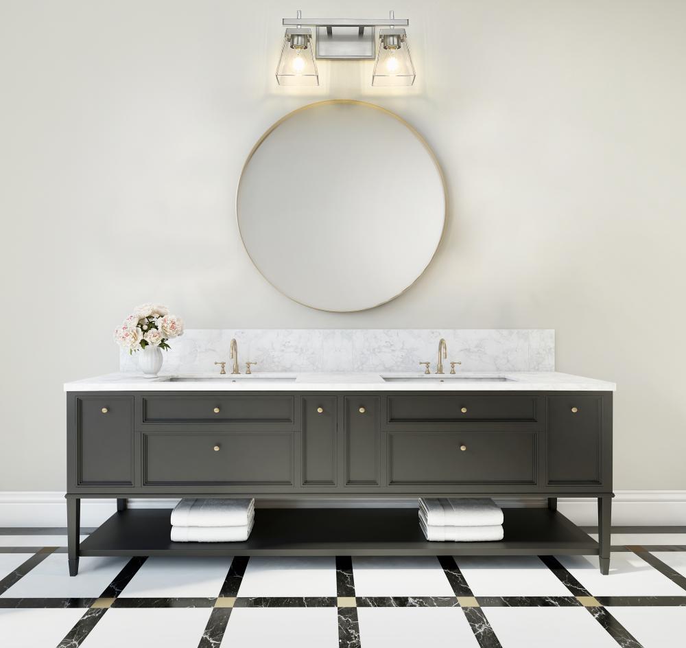 Long, lean lines encourage the clean, simple precision of this modern two-light vanity sconce. Perfect for delivering bright, direct illumination, the sconce features a pair of flared shades, each crafted in clear glass and perched within a brushed nickel finish frame. Mount this sconce with lights up or down to create a spa-like bathroom ambiance.