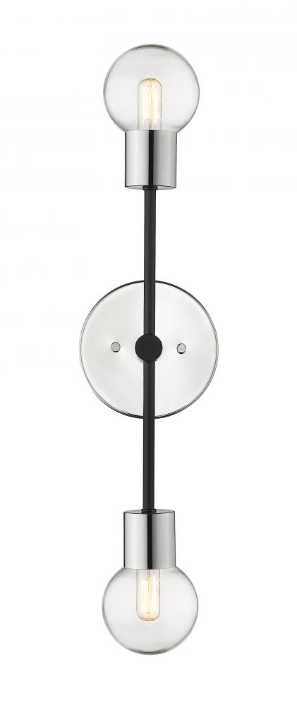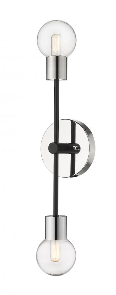 Handsome with a mid-century modern vibe, this contemporary two-light wall sconce from the Neutra collection gives an Art Deco air to any space. This dual pendant wall sconce also includes a plumb steel design, complete with contrasting polished nickel and matte black finishes. In addition, this dual light sconce can be hung vertically as a hallway accent light or horizontally over a bathroom vanity, offering ample lighting with its two clear glass globes.