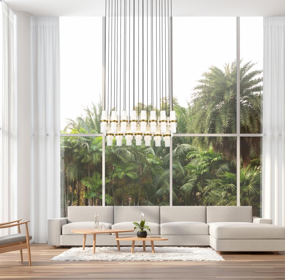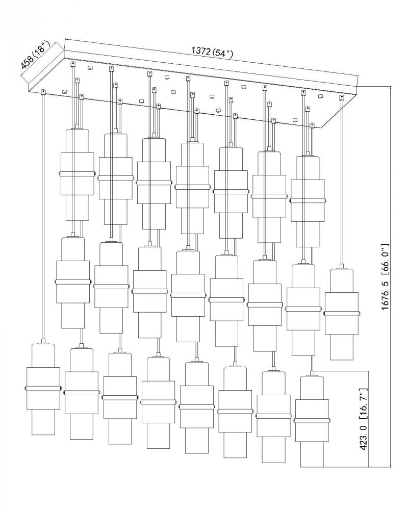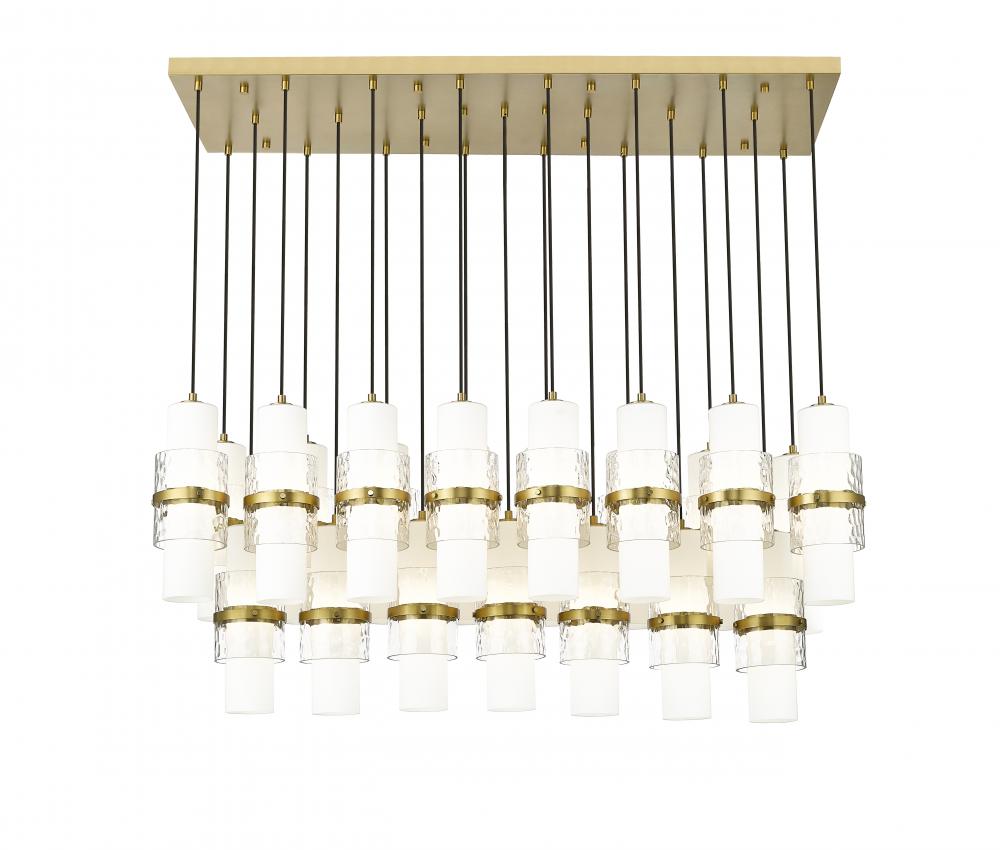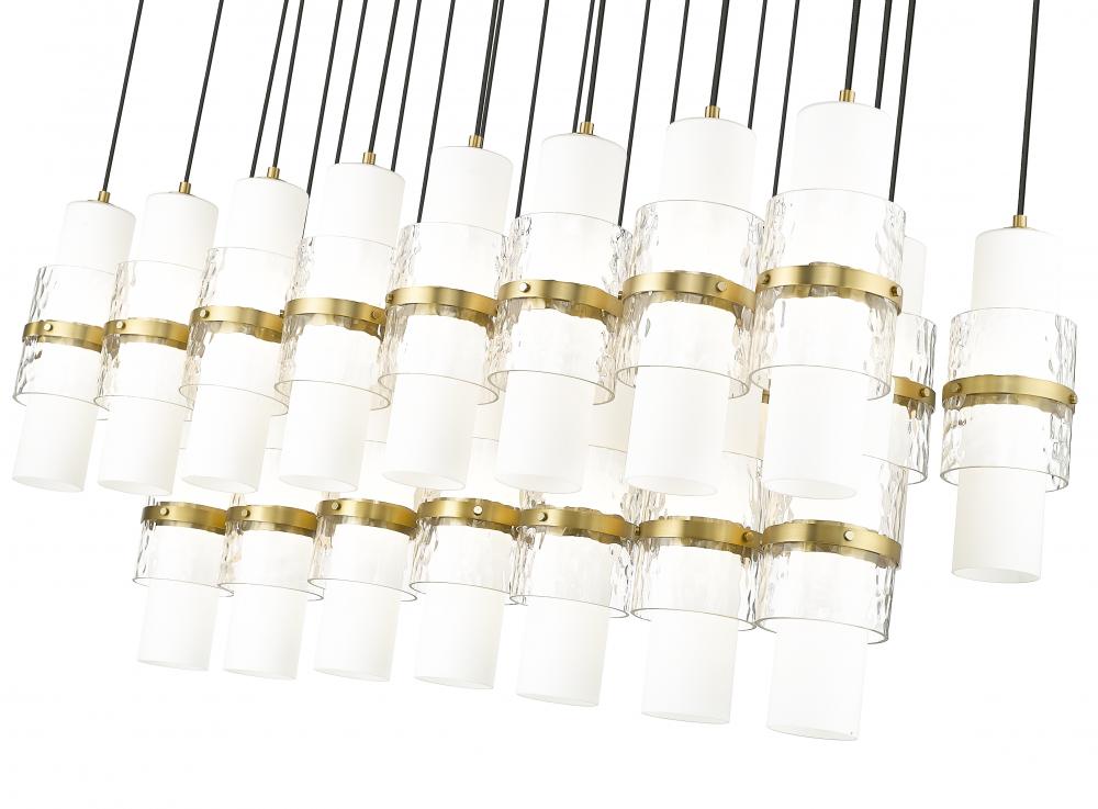 Tiered design and exquisite materials highlight a modern 23-light linear chandelier. Three rows of lights create a spectacular display, each with a layered shade that begins with an etched opal glass cylinder, adds clear textured glass and is secured with a decorative cuff in a rich modern gold finish to match its canopy. Braided cloth cord covers complete the look with fresh elegance, perfect for an island pendant in your kitchen or over a dining table.