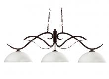 Bold flowing curves define this three light fixture. Finished in bronze, this fixture uses dome golden mottle glass shades to create a contemporary, yet classic look. This fixture includes 72?? of chain on both sides to ensure a perfect hanging height.