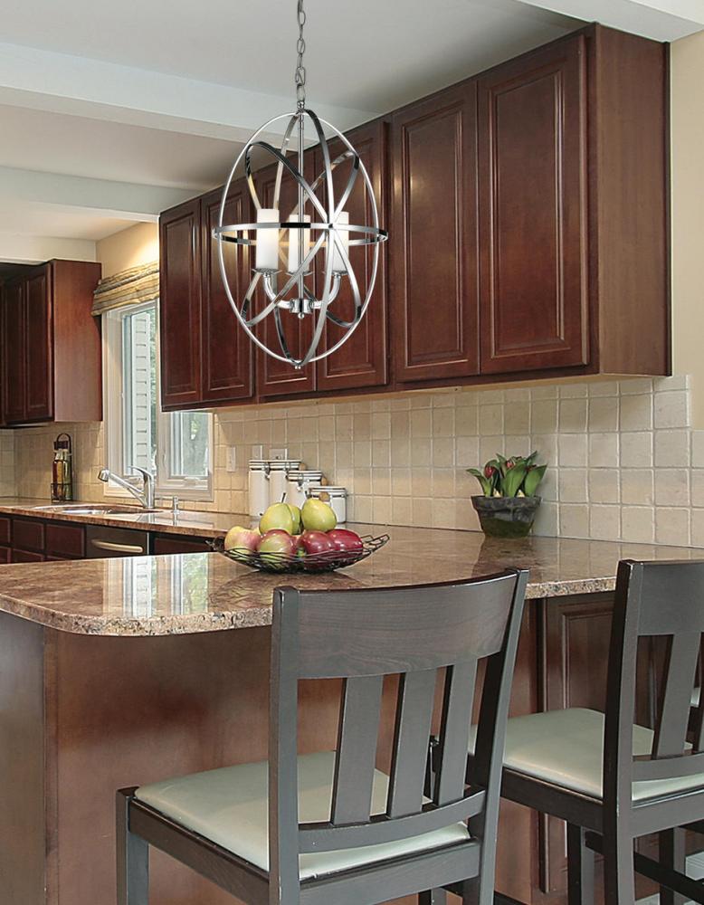 Orbiting metal bands circle the contemporary inner chandelier. This family is made up of round and oval shapes finished in Chrome finishes complimented with matte opal glass.