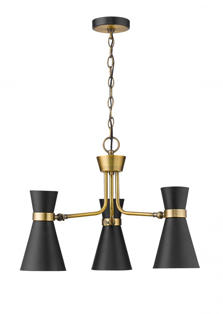 A decorative triplet silhouette shapes industrial influence that adds casual elegance to this matte black finish steel three-light chandelier. Dress up a dining or entertaining space with this tasteful fixture trimmed with heritage brass finish steel. This sleek chandelier captures the heart of romantic industrial charm.