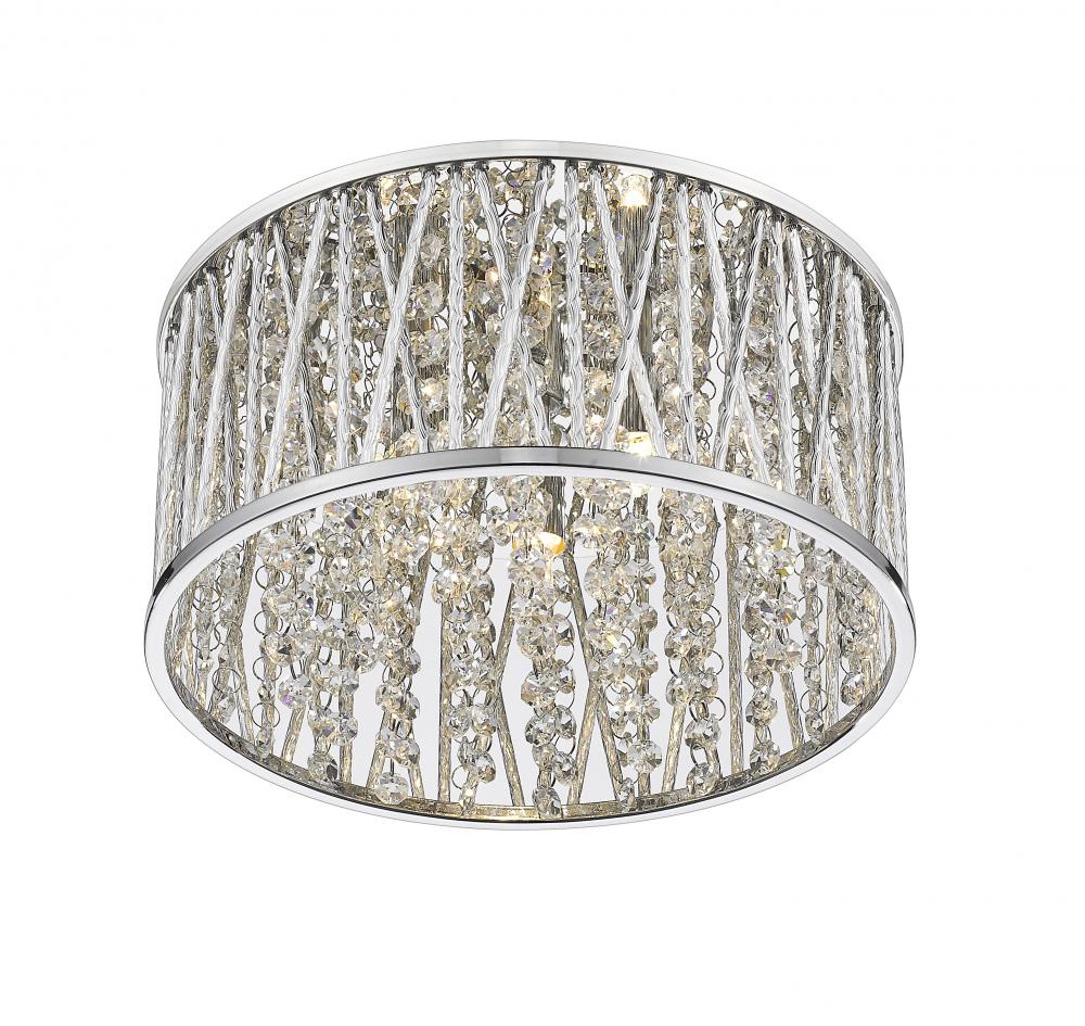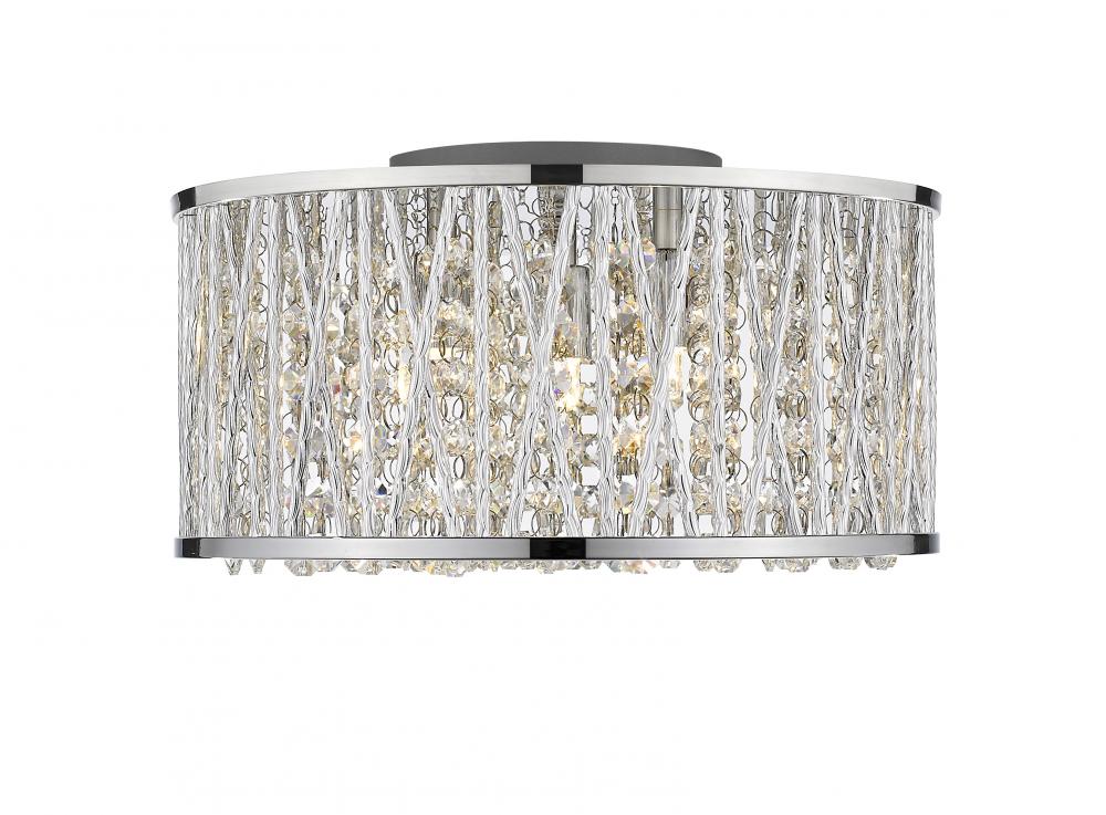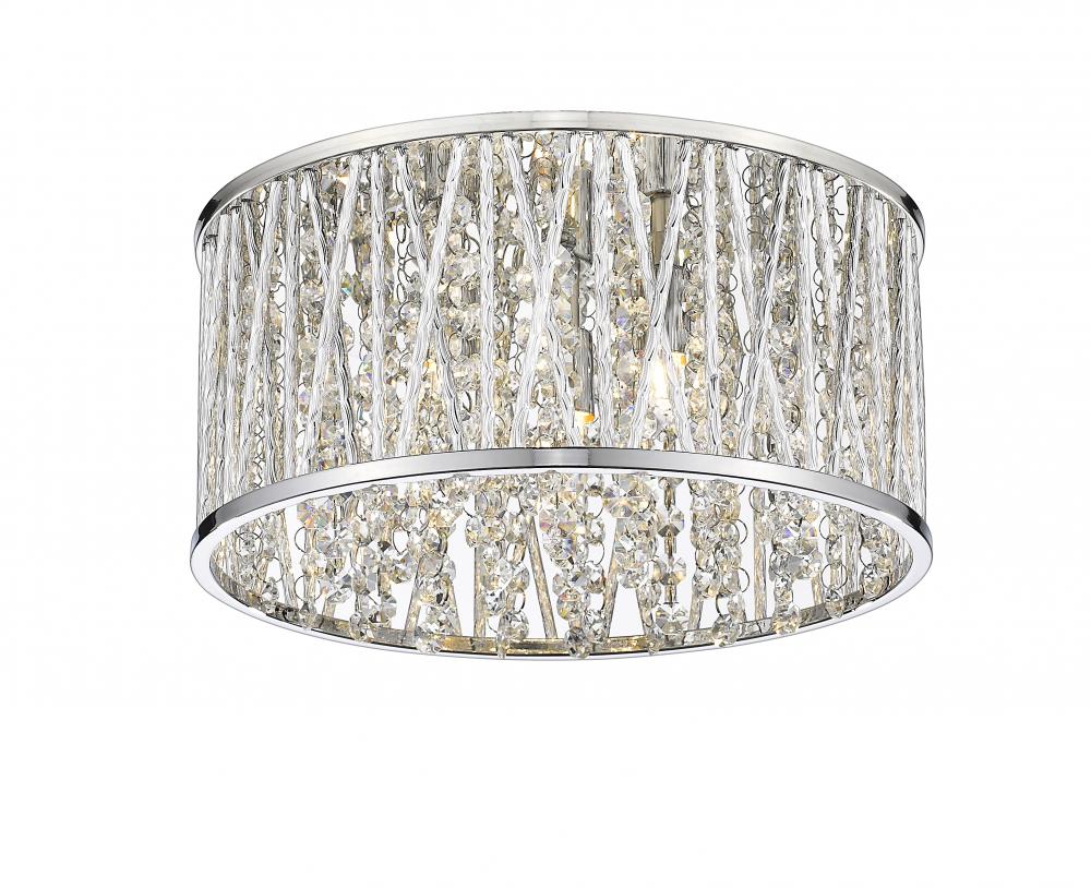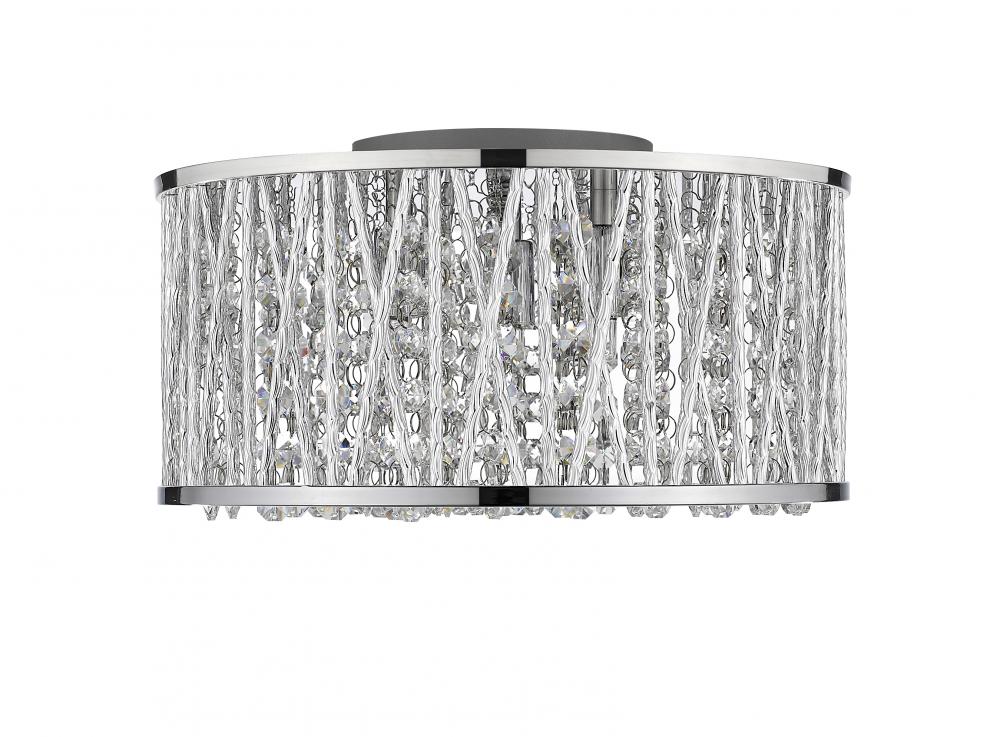 Sleek lines of chrome finished aluminum add a contemporary luster to this gorgeously modern three-light flush mount lighting fixture. Gleaming and glittering lines of polished crystals intertwined with the unusual crossed and single chrome line shade pattern shines in an elegantly modern style.