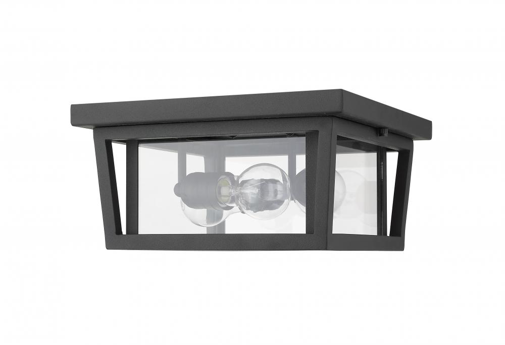 Offer lighting from above in a gazebo or deck space. Flaunting softened geometric design elements, this black finish flush mount outdoor lantern light features charming bulbs tucked behind a clear glass shade.