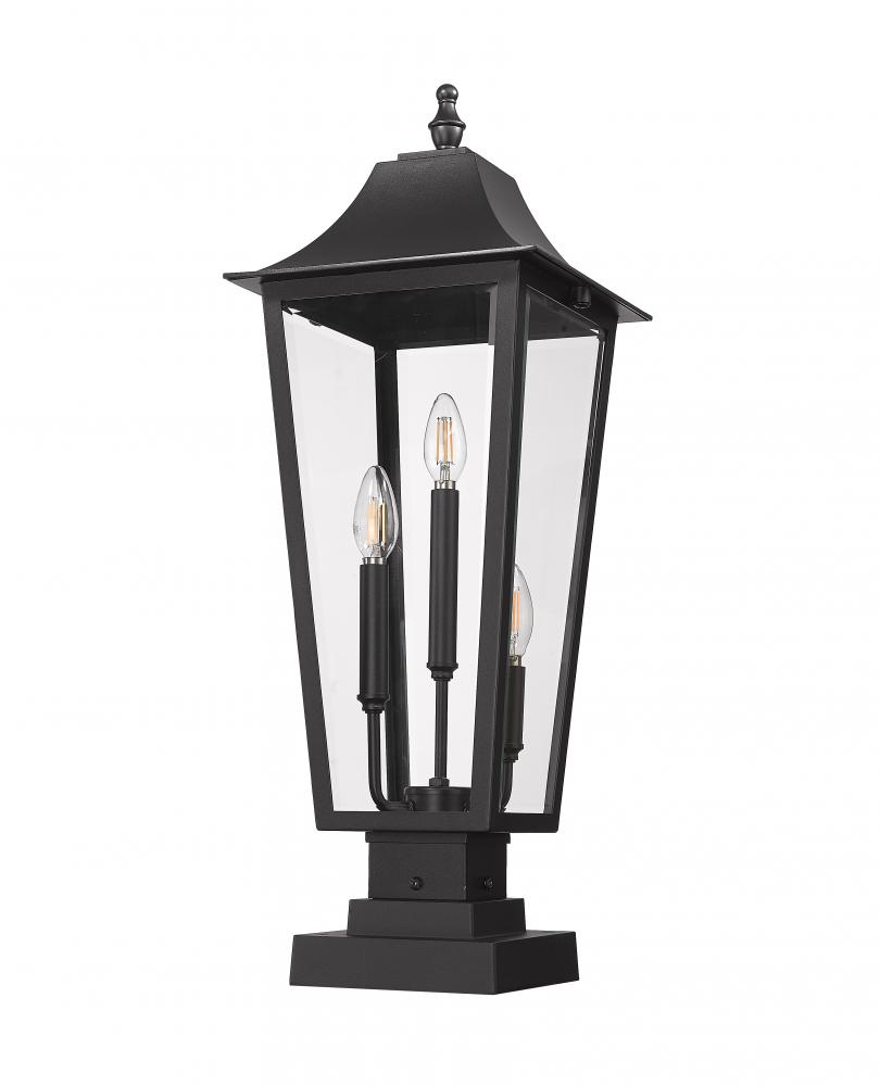 Highlight a welcoming ambiance with the timeless details of a traditional three-light outdoor pier mount fixture and its elongated silhouette. Coastal black creates depth and contrast when paired with clear beveled glass panes, offering bright illumination to enhance its elongated lantern silhouette to perfection.