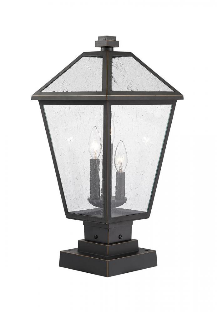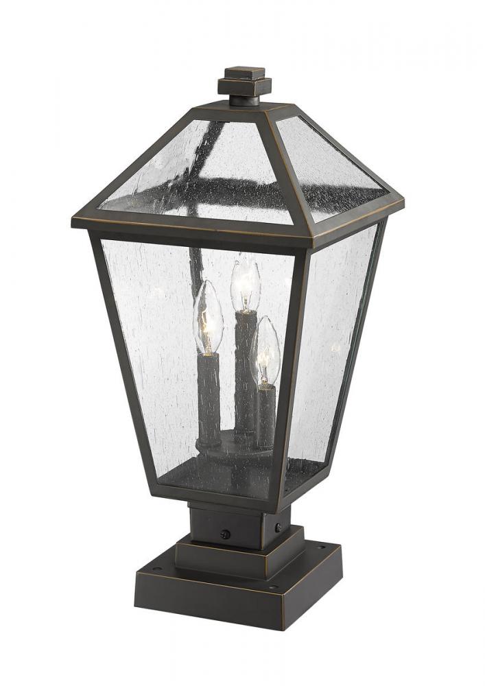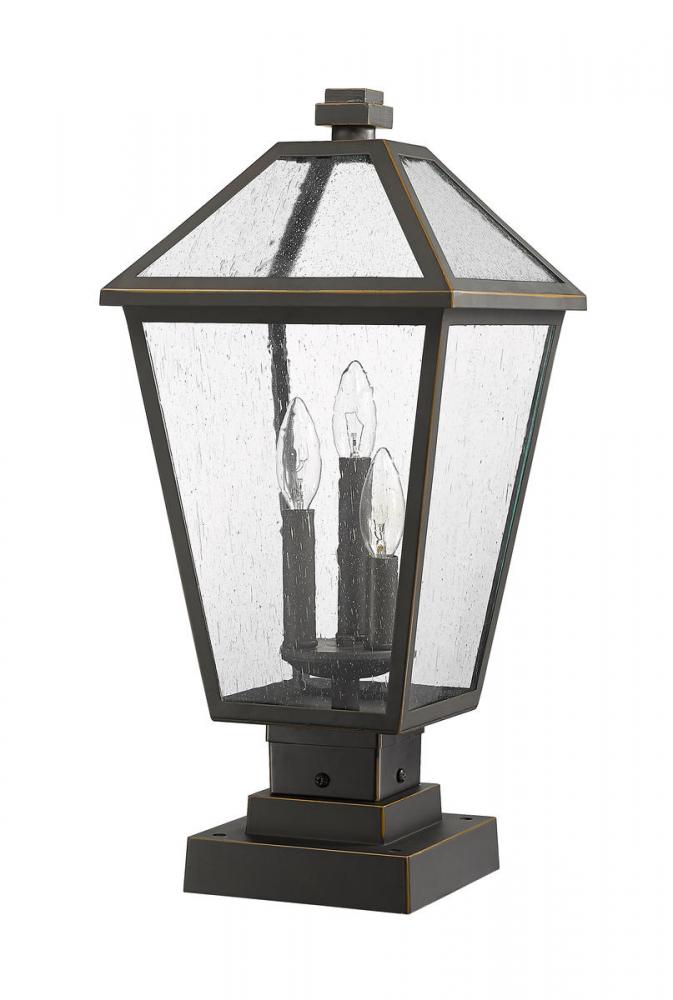 Illuminate an exterior front or back walkway with a classic fixture reflecting a charming village theme. Made from Rubbed Bronze metal and seedy glass panels, this three-light outdoor pier mounted fixture delivers a charming upgrade with industrial-inspired attitude and a layered silhouette thats perfect for lower-level gardens and walkways.