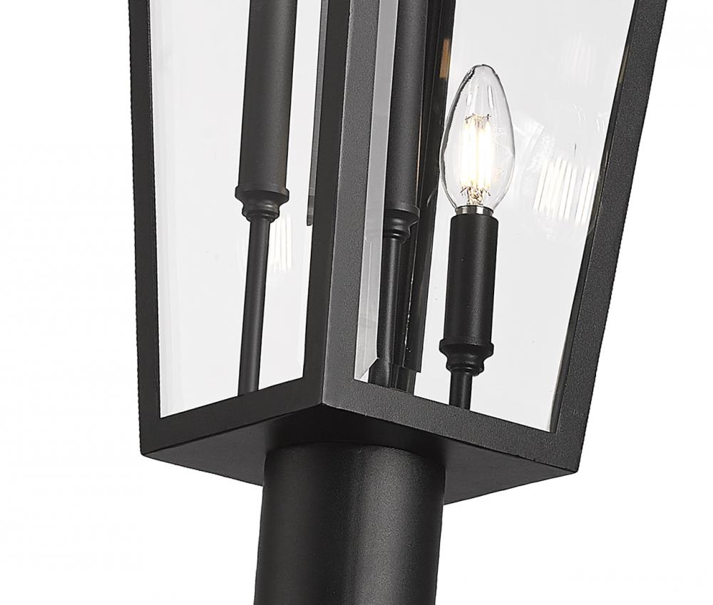 Beveled glass panels add a hint of dimension to the elongated lantern silhouette featured in this modern three-light outdoor post mount fixture. In Coastal black that adds contrast and durability, the lantern delivers character with its elongated profile, perfect for your landscaping or walkway.