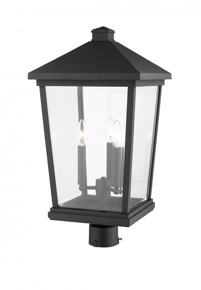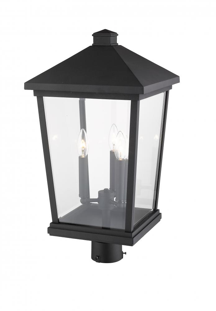 This small outdoor post lantern is ideal for illuminating a compact exterior space. With a black finish frame and clear beveled glass, it creates a charming village theme that embellishes custom design schemes.