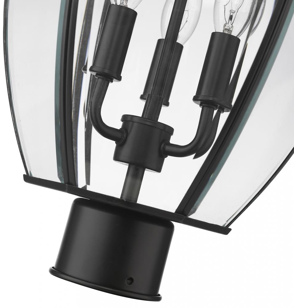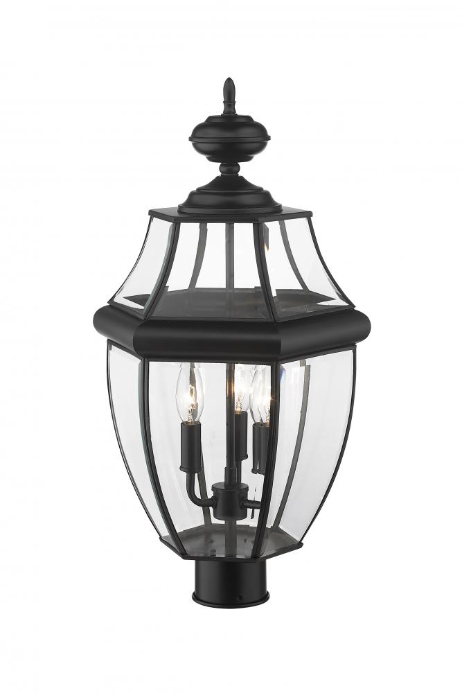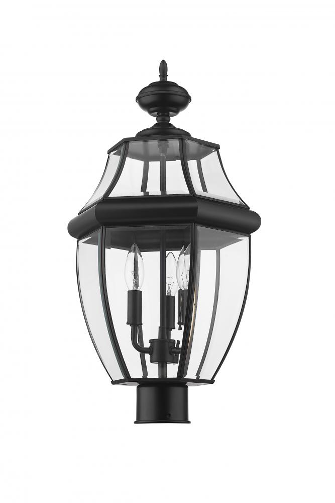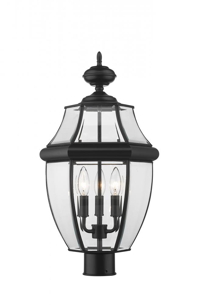 This three-light outdoor post mount fixture adds a traditional silhouette to the lighting in your patio, deck or other outdoor area. With its candelabra composition, the lamp provides soft, effective illumination. A multi-sided clear beveled glass shade has a black steel frame, creating an elegant impression.