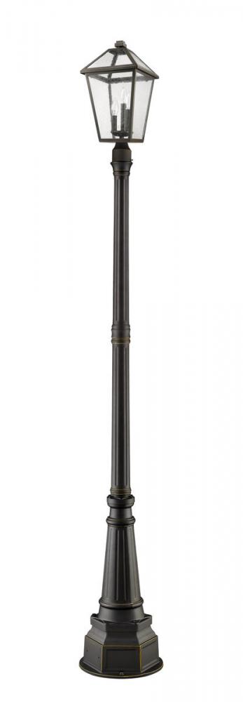 Light up an exterior space with a classic fixture reflecting a charming village theme. Made from Rubbed Bronze metal and seedy glass panels, this three-light outdoor post mounted fixture creates a sophisticated and compelling addition to a custom landscaped area.