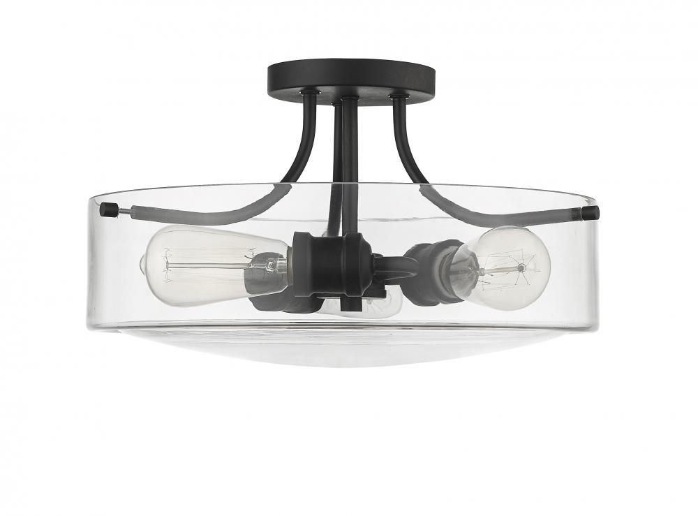 Play up an industrial motif with this charming three-light semi-flushmount ceiling light. Crafted in matte black with a clear glass shade, this stylish fixture is a wonderful update in a bedroom or home office.