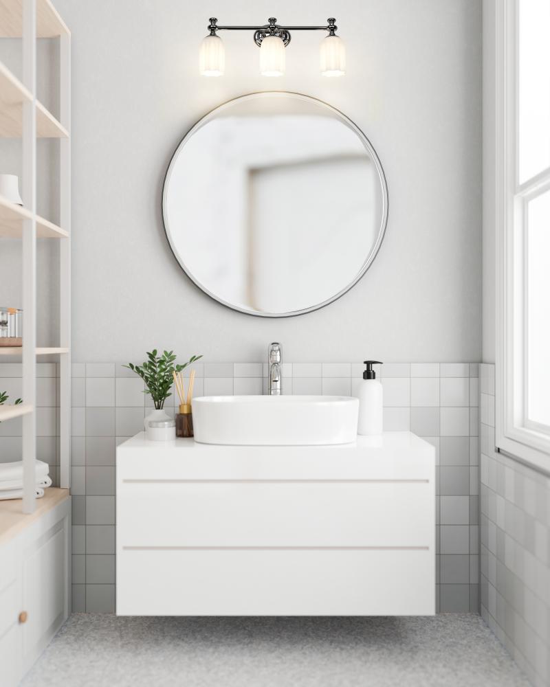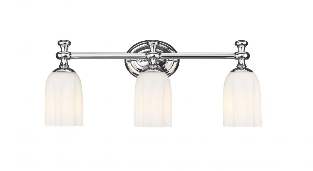 Gleaming chrome adds a touch of shine to the opal etched glass featured on a modern three-light vanity fixture. It infused a sense of delicacy and romance with decorative flourishes over the shades and delicate scalloped glass. Three lights create bright ambient illumination, ideal for daily grooming and beauty tasks.