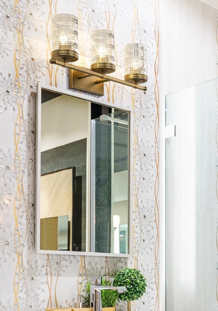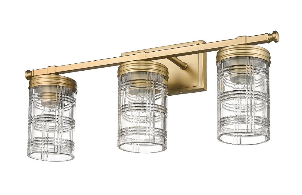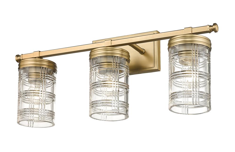 Elevate a traditional-leaning master bathroom with this elegant classically designed transitional three-light vanity wall sconce. Three cut crystal-inspired cylinder glass shade offers an old-world restoration feel with a handsome Glen plaid pattern, projecting a scintillated effect across countertops and vanities. A lustrous heirloom gold finish throughout offers a warm metallic tone, lending a metropolitan glam touch to this three-light wall sconce, making it a perfect addition to spacious double vanities.