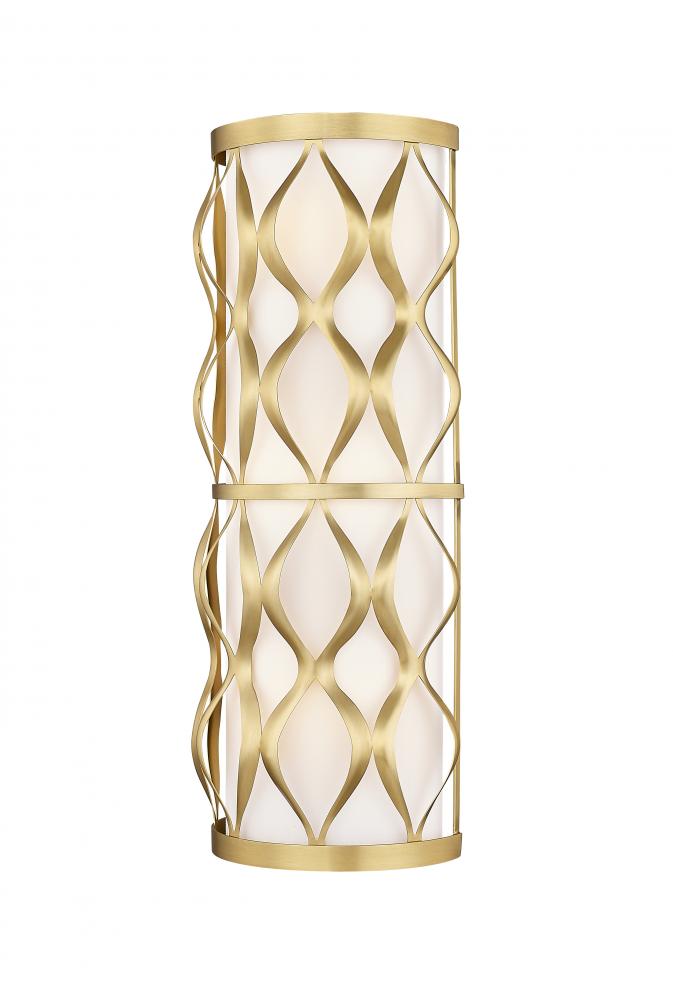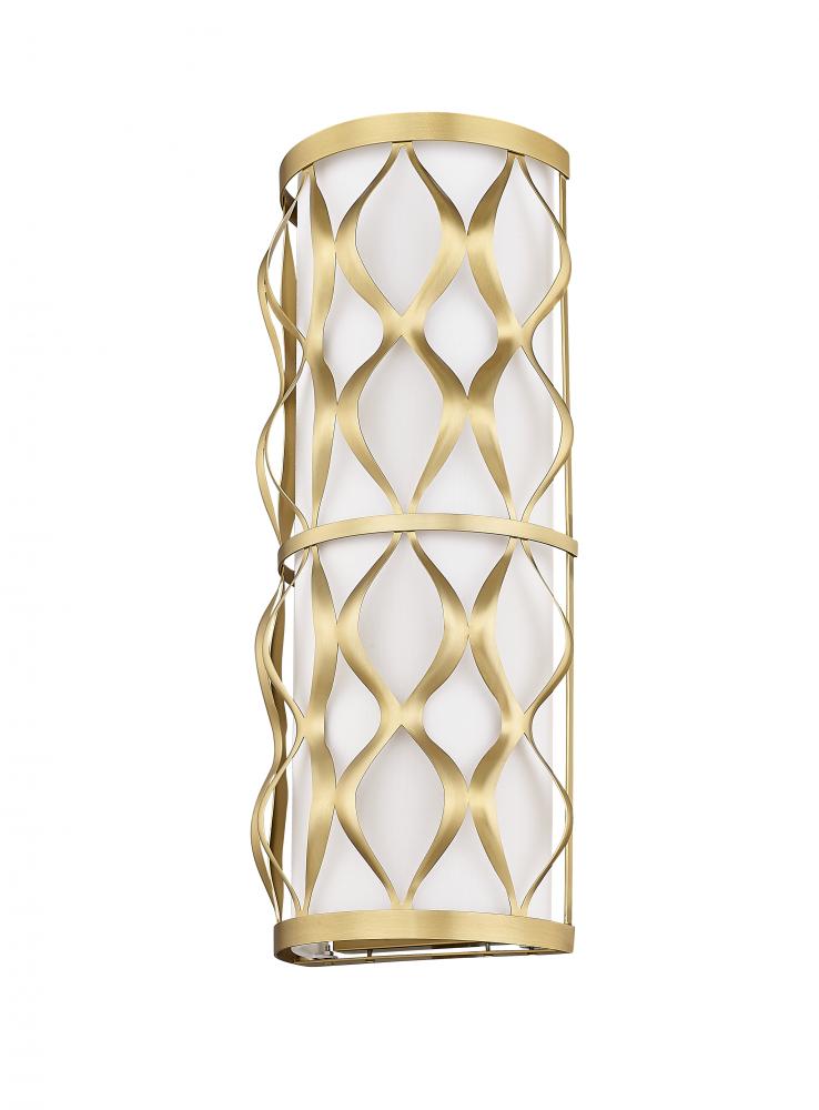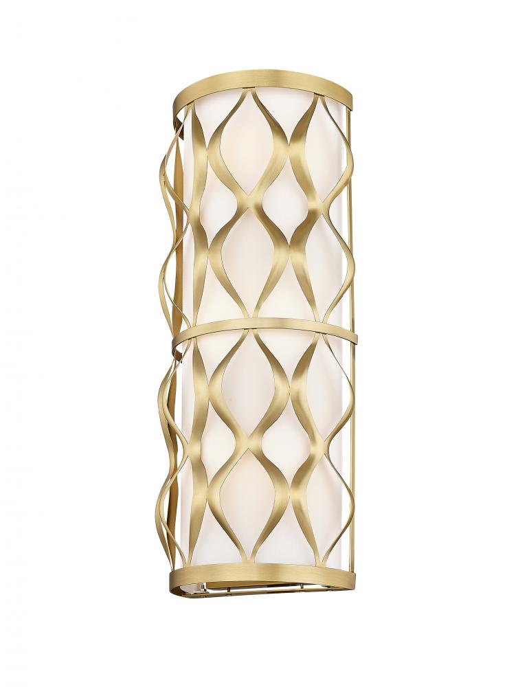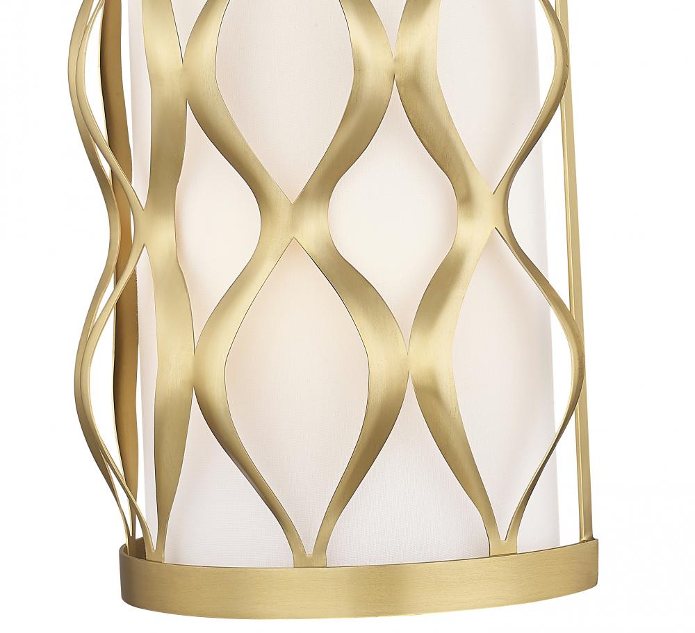 With an open-concept design marked by wavy vertical metal elements perfectly spaced on its modern gold finish steel frame, this three-light wall sconce reflects a gallery influence as it illuminates hallways, living areas, and bedrooms. Candelabra-style lights glow through a white fabric diffuser, a tantalizing contribution to its curvy ribbon detailing. Timeless and seamless style add versatility and a theatrical flavor to this elegant wall sconce.