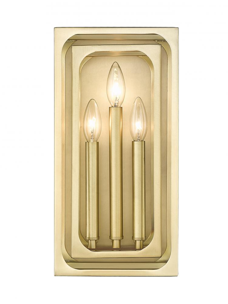 Choose the ultra-glam ambiance of a gleaming fixture perfect for making a tasteful impact in modern and transitional spaces. The Easton metal three-light wall sconce creates a mixed industrial and farmhouse look with candelabra bulb mounts set in a graduated arrangement, centered in full view thanks to a dual-layered openwork rubbed brass finish metal frame. A bold version of minimalism softens with a warm finish, accomplishing its objective with extraordinary minimalist construction.