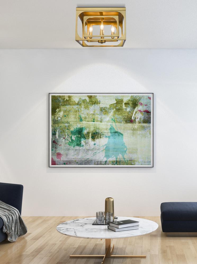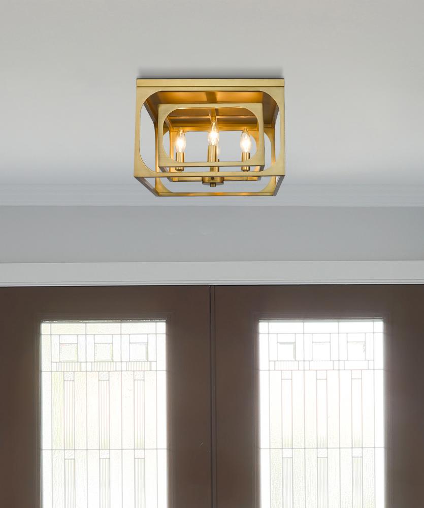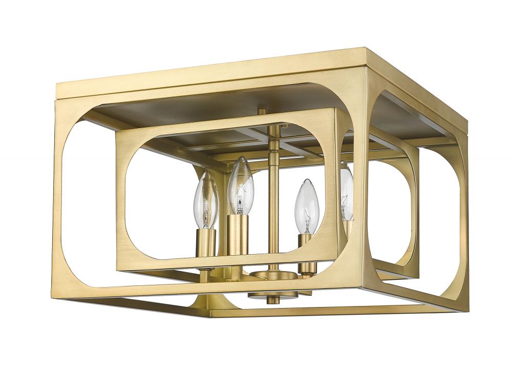 A superb mix of old and new follows modern industrial and farmhouse aesthetics, building a focal point through lighting and a warm, gleaming finish. The Easton collection offers a four-light flush mount ceiling light with linear elements and an orderly aesthetic ideal for a signature style. Candelabra bulb mounts align in a graduated arrangement, centered in full view thanks to a dual-layered openwork rubbed brass finish metal frame.