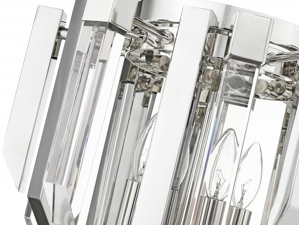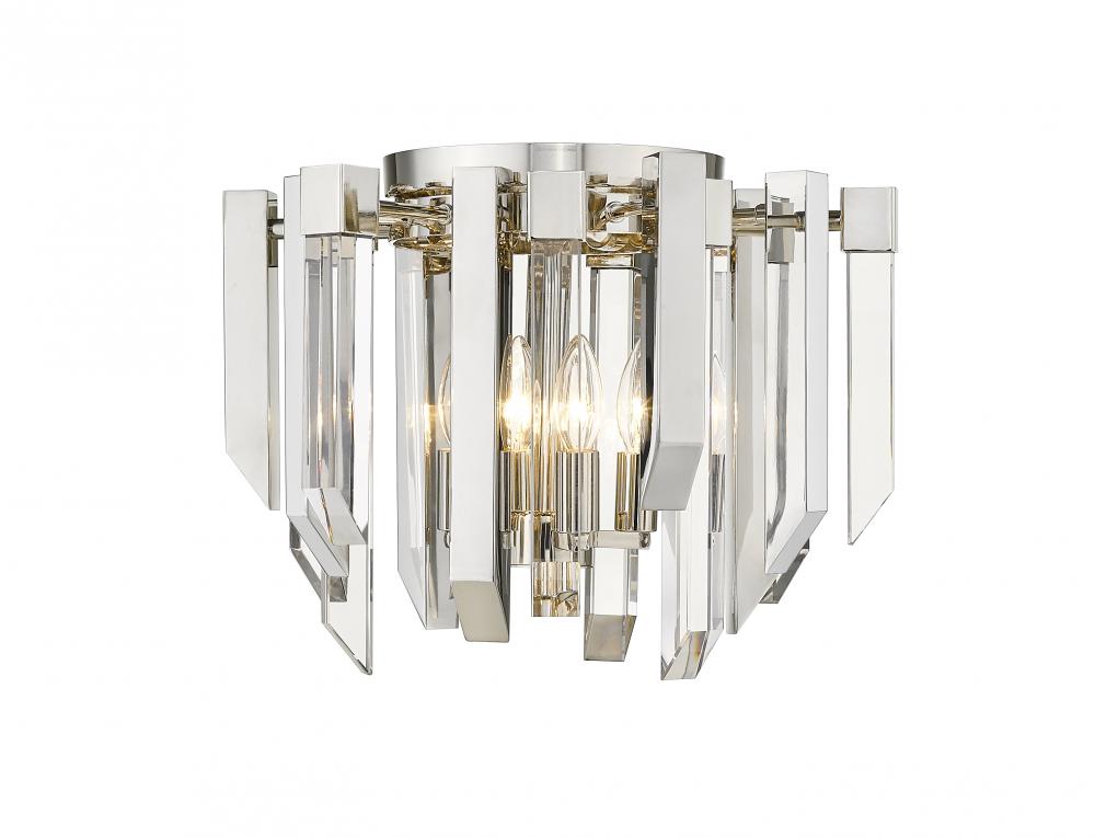 Add some sparkle to a hallway or foyer with this exquisite, clear crystal flush mount ceiling light. This stunning fixture flaunts four glowing lights that glisten and gleam against the dazzling crystal shade and shining polished nickel frame.
