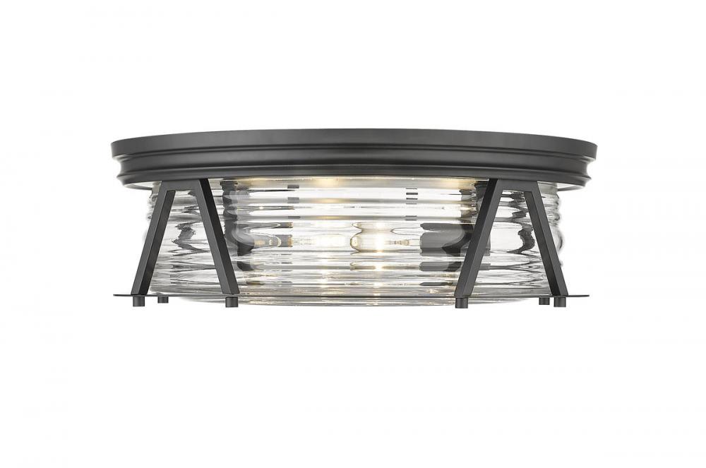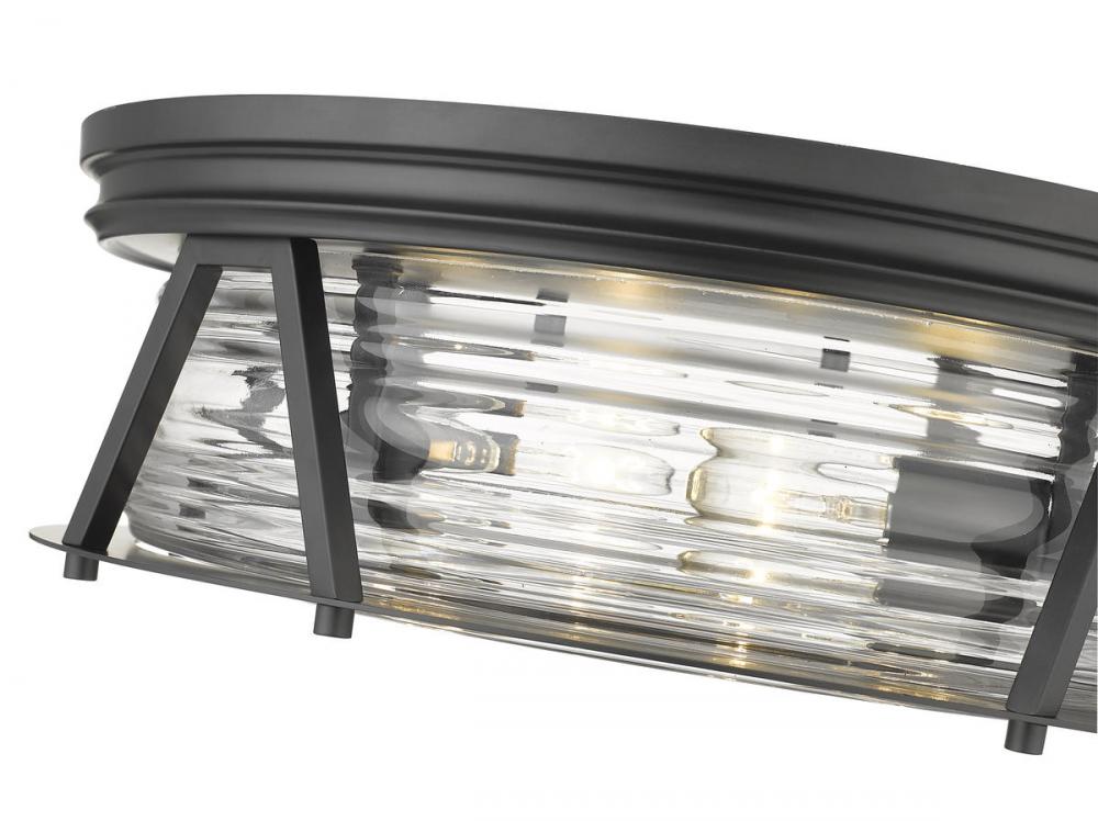 Delivering bright lighting for a modern space, this matte black and glass four-light flushmount ceiling light covers all design bases with a nautical-inspired motif serving industrial, modern, and Art Deco aesthetics. Emulating a Fresnel lens found in historic lighthouses on coastal North American shores, this light from the Cape Harbor collection blends chic ribbed glass with bold matte black finish steel to create versatility and an expressive look in any contemporary or transitional space.
