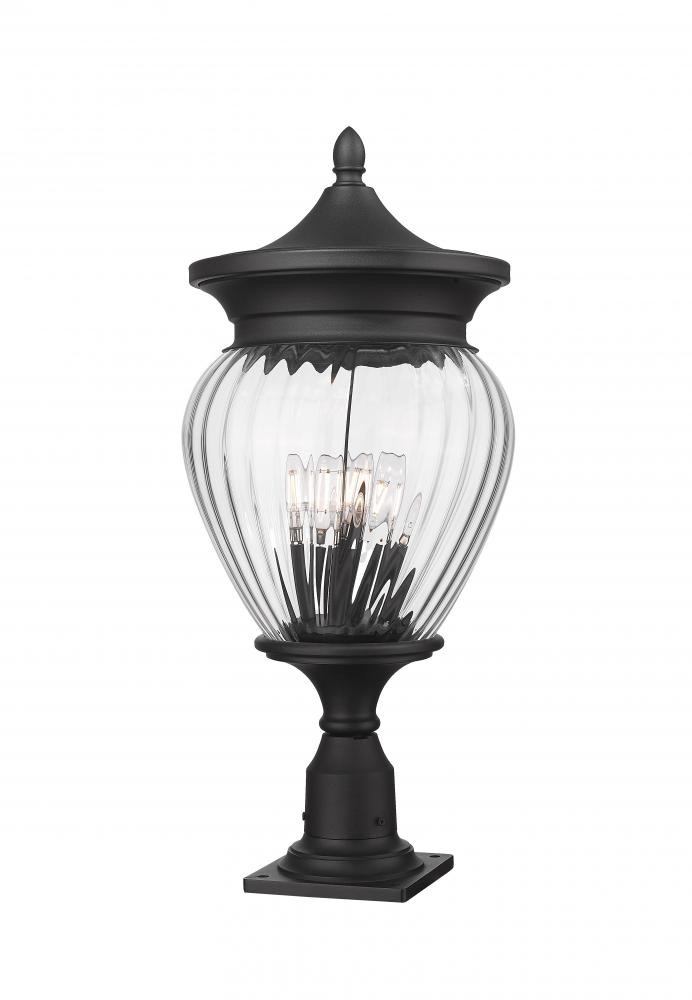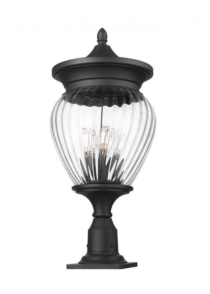 Hints of soothing Eastern influence and gallery glam join together, embellishing an exterior space as this four-light outdoor pier-mounted fixture is a must-have light source for gardens and landscaped areas. Aluminum framing with a Coastal black paint finish creates ornate silhouetting as it nestles an alluring ribbed glass shade with a teardrop profile that brings vintage character. Candelabra lights add extra soft, chic beauty to this dimmable fixture.