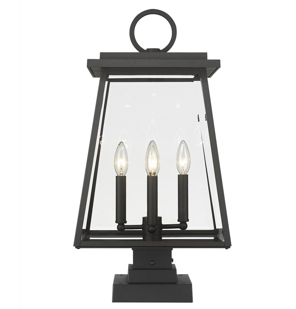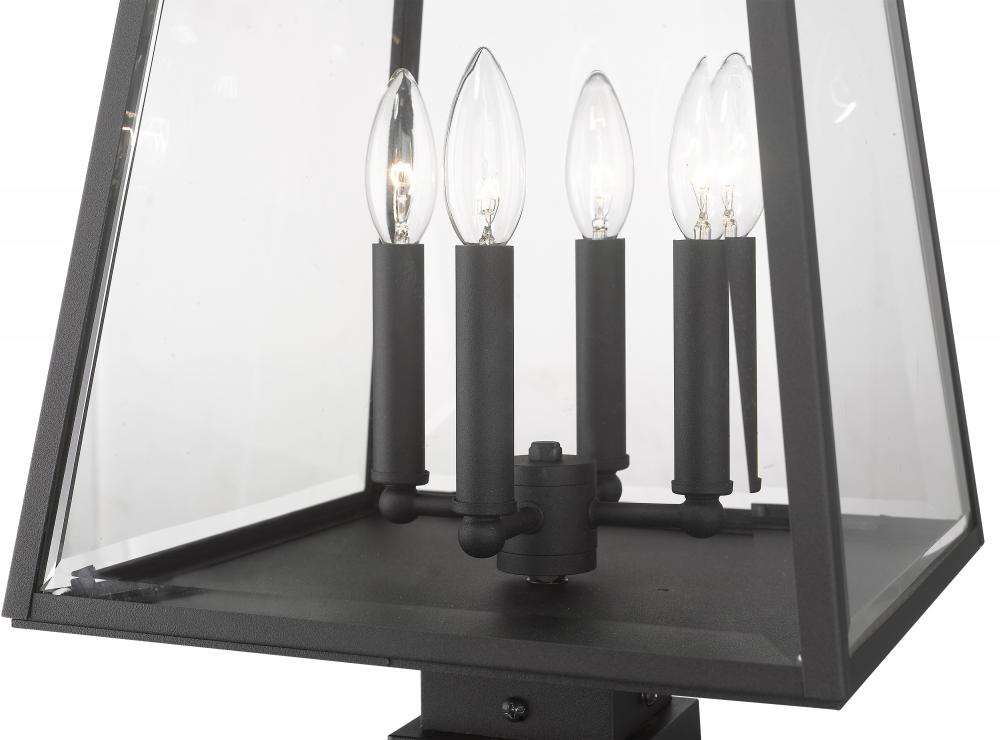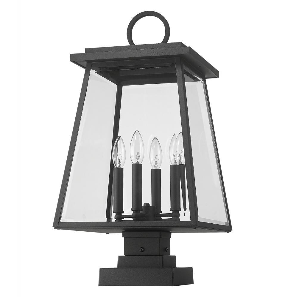 The romantic ambiance of old village nautical aesthetics visit an exterior space with a light fixture that dresses up a walkway or landscaped space. From the Broughton collection, this four-light outdoor pier-mounted fixture offers construction of sleek black aluminum and clear beveled glass panels on its lantern-style shade. Charming candelabra bulb mounts seal the deal on a tasteful look.