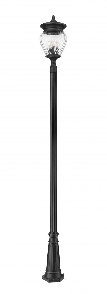 Exterior spaces deserve decadent lighting with a soft glow and sleek style. This four-light outdoor post-mounted fixture is a romantic feature, with a clean-lined pole paired with ornate accents that include a clear ribbed glass shade. With a smooth Coastal black paint finish, its dramatic impact is softened with charming gallery style and a gently contoured post.
