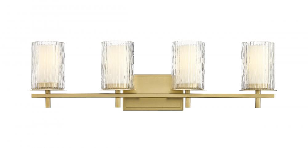Artistry and layering form a focal point in a modern four-light bath vanity light with an impressive look. Intricate detail is textural and artisan with clear glasswork in a cylinder shape, with an inner white diffuser. Etched opal and clear glass blend as they enhance chic modern gold finish framing and show off a crisp mix of circles and lines.