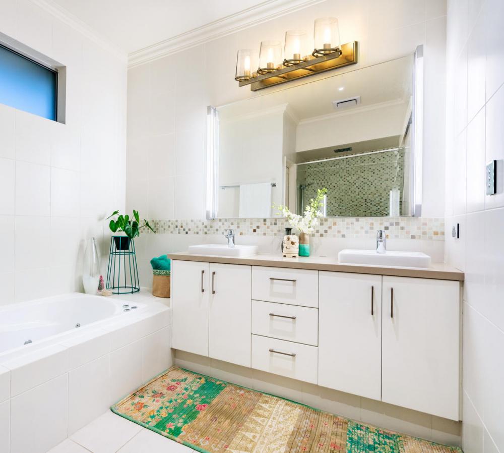 Rich in modern character, this elegant, rubbed brass vanity light brings a bathroom together in style. This four-light fixture features clear glass shades for a brilliant and luminous glow.