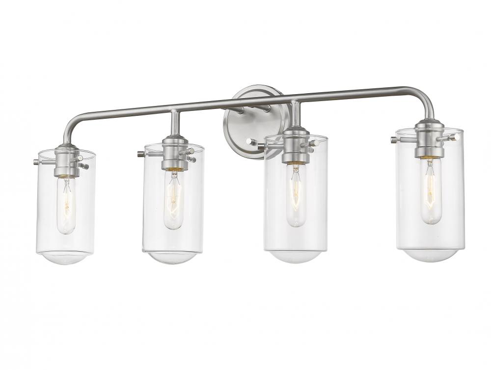 All eyes avert upward to take in the beautiful design of this four-light bath light. Gorgeous brushed nickel steel and clear glass shades form a delicate look with an edgy industrial aesthetic.