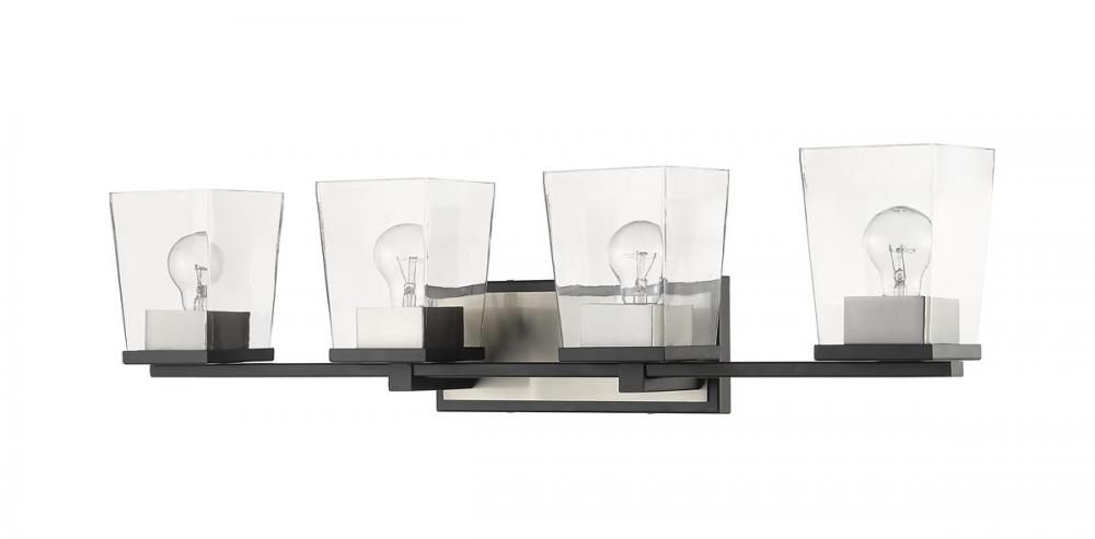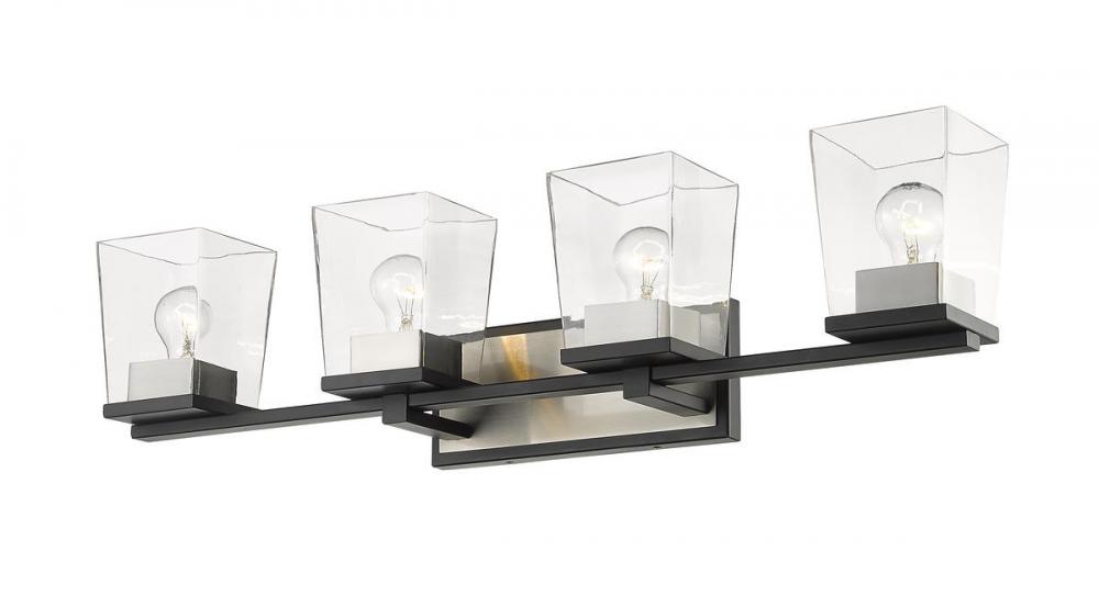 With a sleek cosmopolitan attitude and a beautiful blend of glass and metal, this four-light vanity offers a sophisticated way to stylize a contemporary bath space. Matte Black and Brushed Nickel serve as stunning finishes for a tasteful fixture delivering a geometric silhouette that flatters custom vanities with a neutral palette.