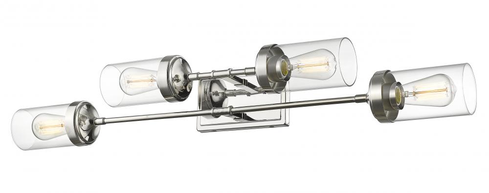 This enticing four-light vanity fixture delivers the sleek look of polished nickel steel and the charming allure of clear glass cylindrical shades. Linear styling creates an eye-catching effect that goes a long way toward polishing the look of an updated master or guest bath.