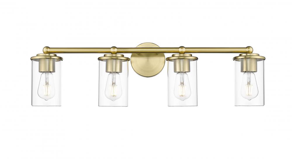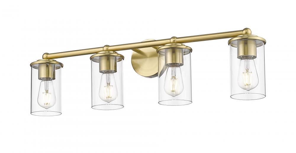 Appreciate the versatility of modern simplicity in a chic, modern four-light vanity fixture. From the Thayer collection, its a charming, understated design that pairs graceful curvature with a chic, warm luxe gold finish and cylinders of crystal clear glass for bright, direct illumination ideal for a master or guest bath.