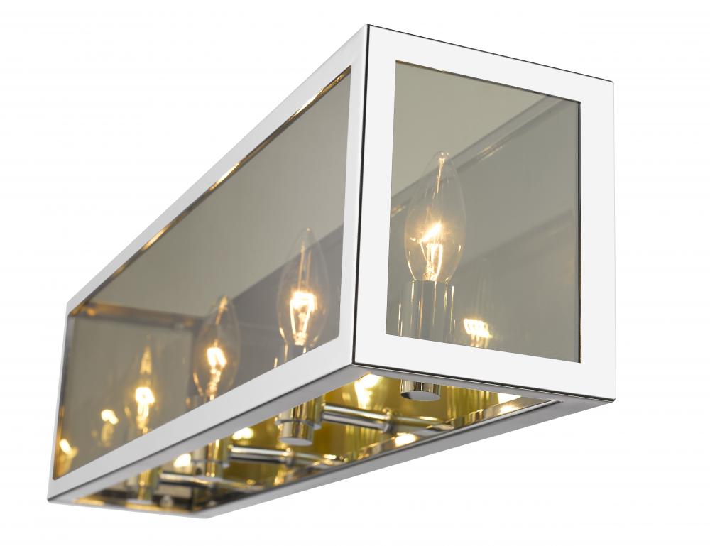 Choose this decadent contemporary four-light vanity light for its chic blend of steel and mirror, and a geometric linear silhouette that updates modern bathrooms. A double frame made from chrome finish steel joins both clear and smoke glass to deliver a soothing, atmospheric aesthetic with plenty of inspiration. Candelabra bulb mounts create an opportunity to change up the motif and fit into transitional spaces.