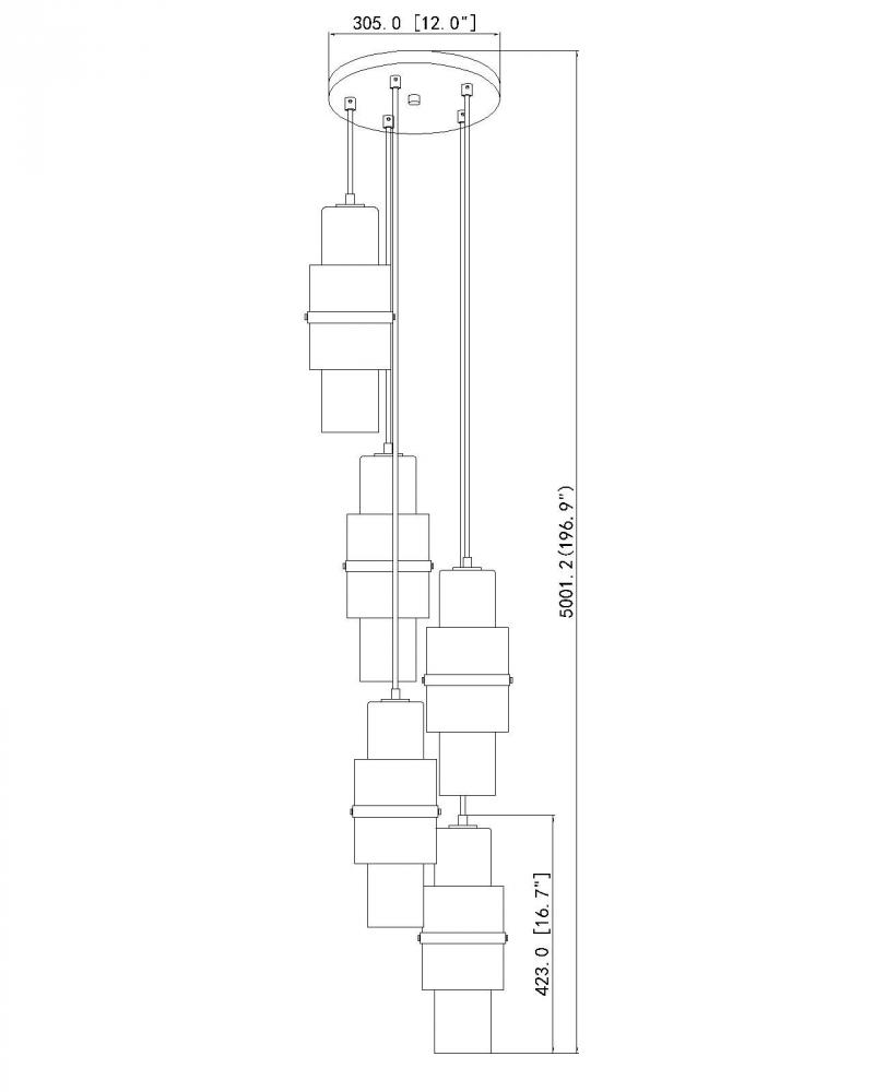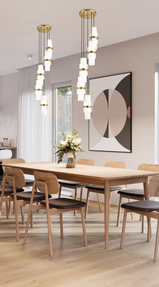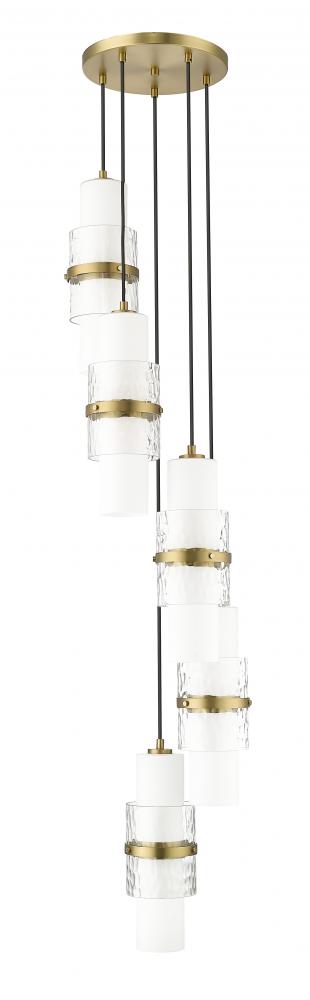 A chic spiral of cylindrical shades creates a compelling silhouette for this modern five-light chandelier. Perfect over a staircase or dining table, the chandelier features a modern gold finish canopy and decorative cuffs, which complement etched opal and clear textured glass cylinders that combine to create a stunning display.